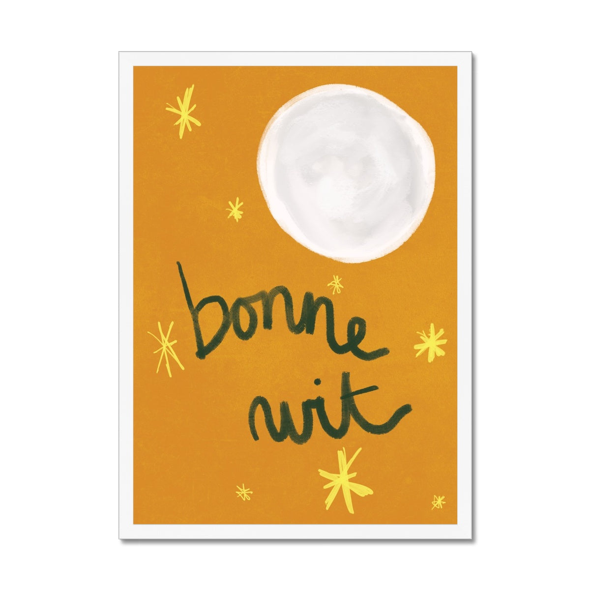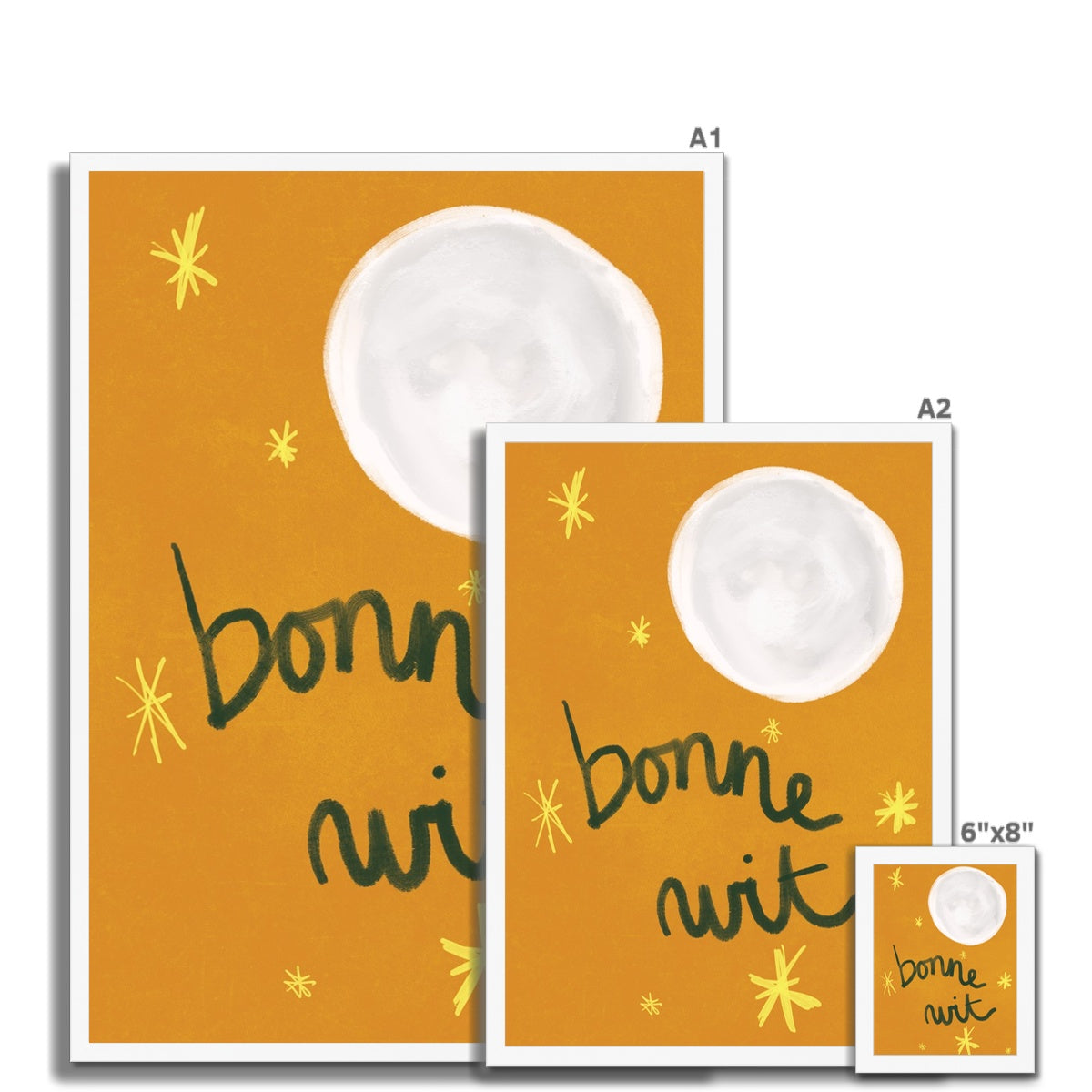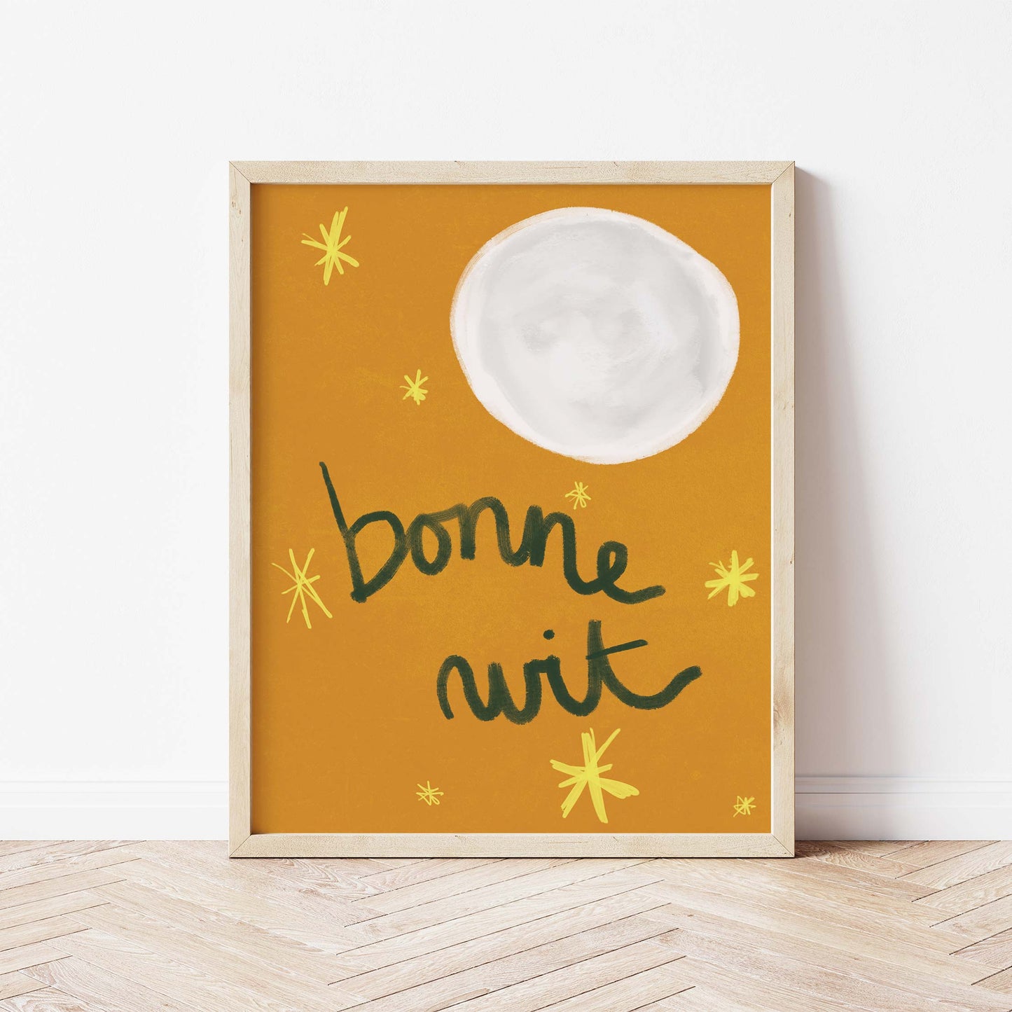 Our art print has the french words 'bonne nuit', meaning goodnight, hand lettered in a gouche painted style in a dark green, with a brown textured background full of yellow stars, with a dreamy moon above. It is digitally printed by professional printers who are specialists in Giclée fine art printing.