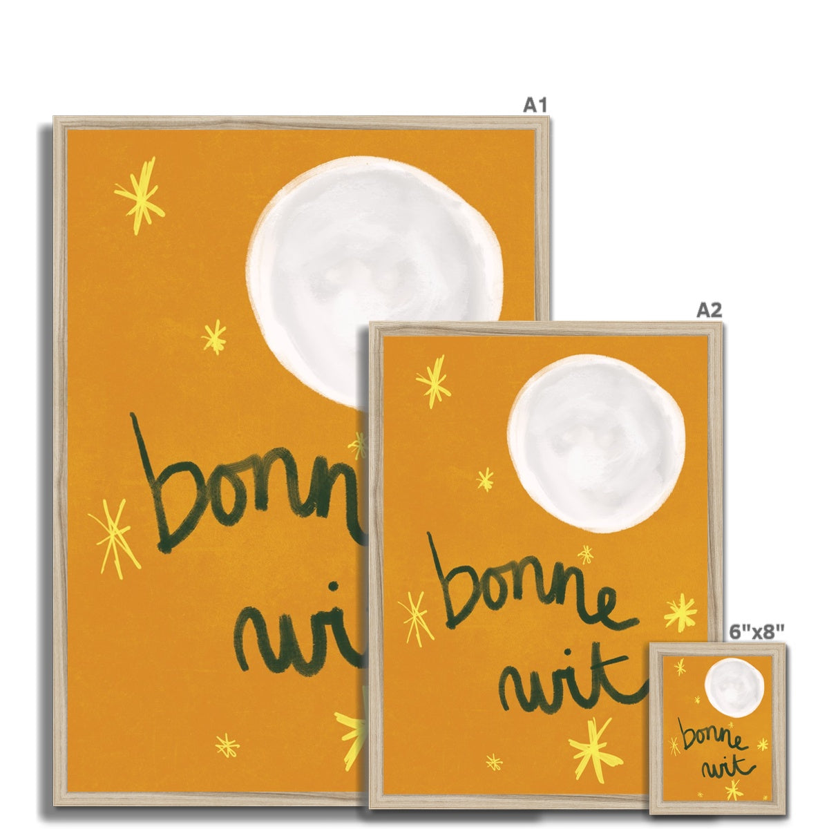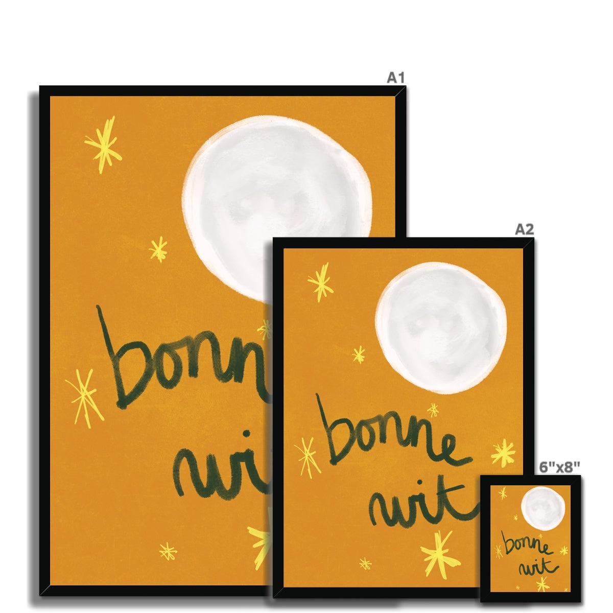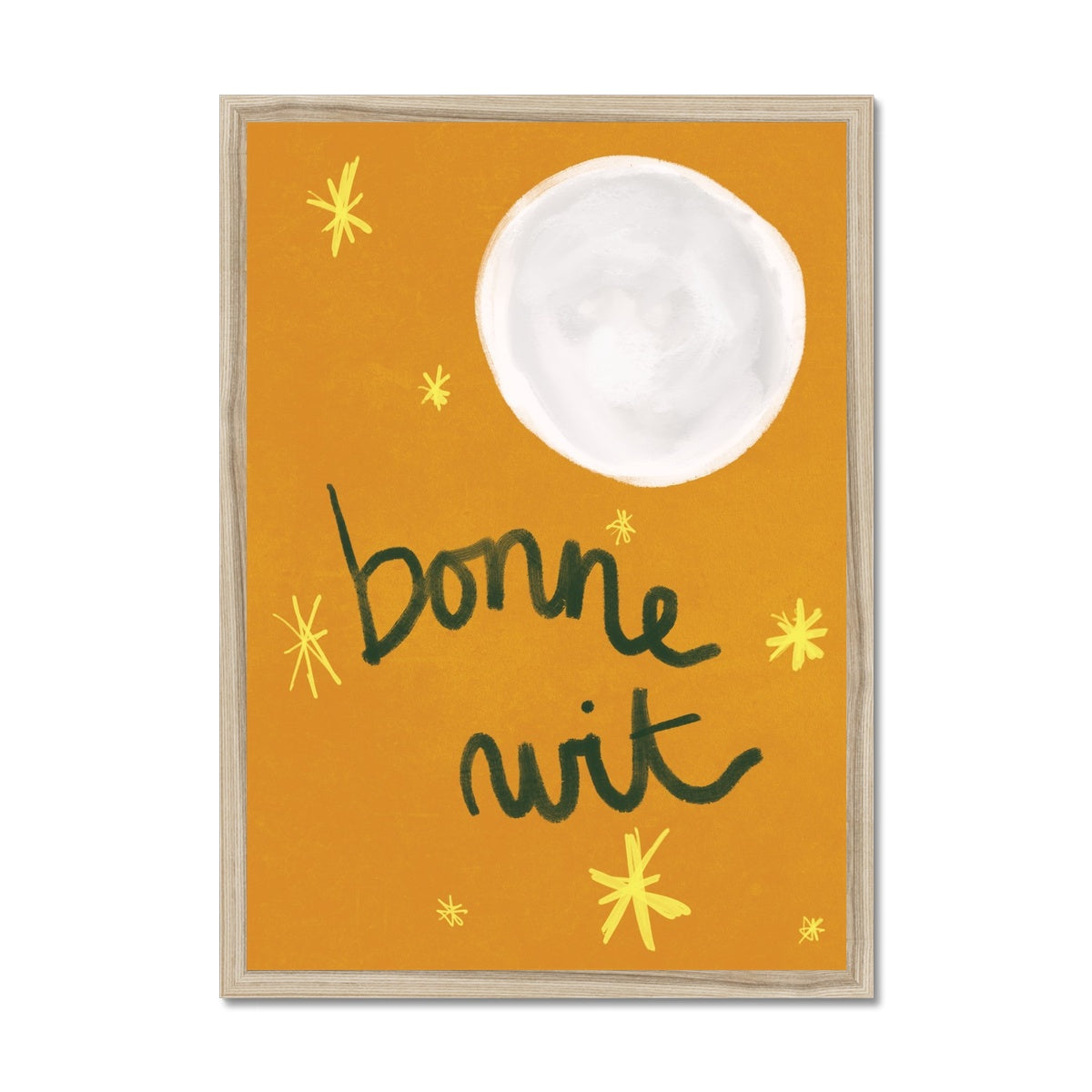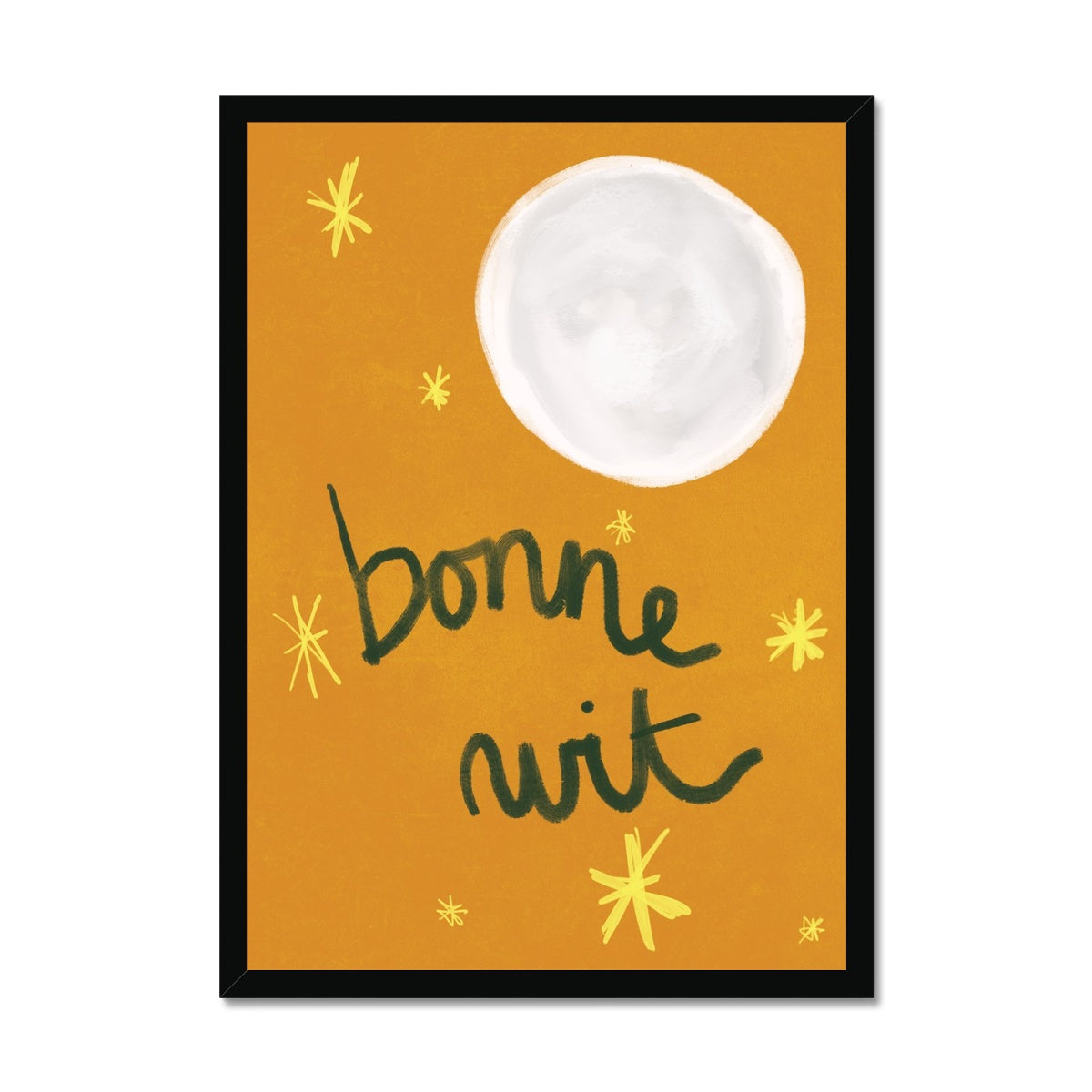 Our art print has the french words 'bonne nuit', meaning goodnight, hand lettered in a gouche painted style in a dark green, with a brown textured background full of yellow stars, with a dreamy moon above. It is digitally printed by professional printers who are specialists in Giclée fine art printing.
