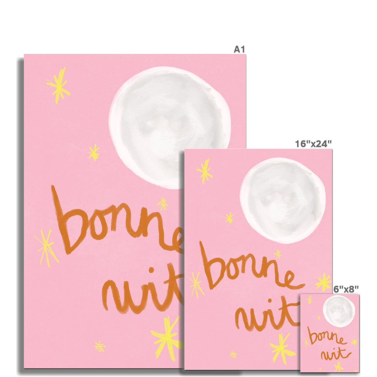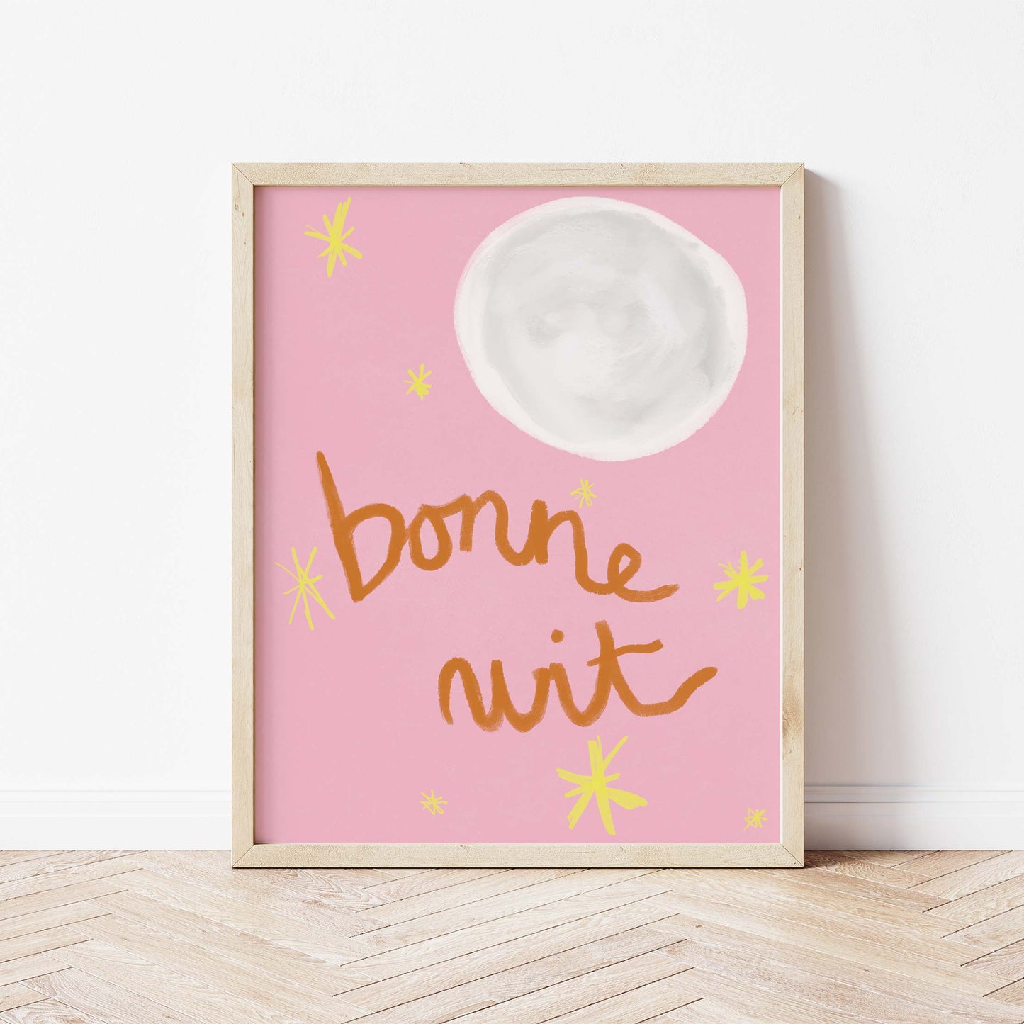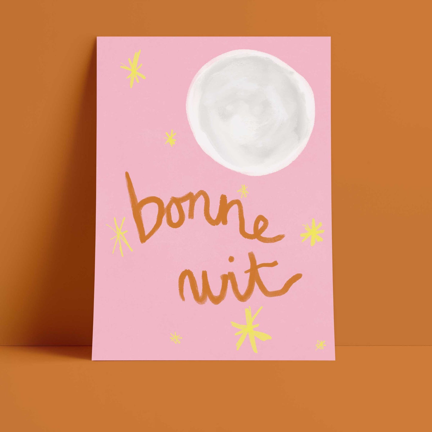 Our art print has the french words 'bonne nuit', meaning goodnight, hand lettered in a gouche painted style in brown, with a pink textured background full of yellow stars, with a dreamy moon above. It is digitally printed by professional printers who are specialists in Giclée fine art printing.