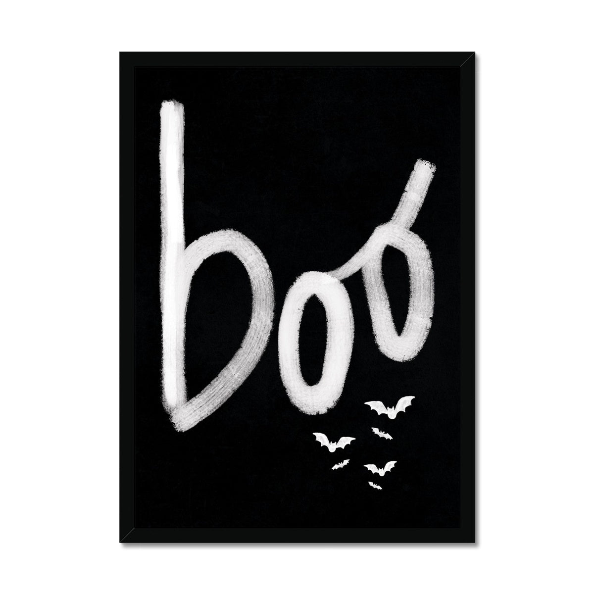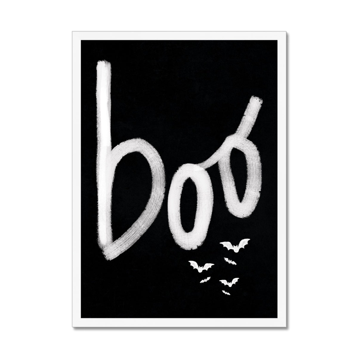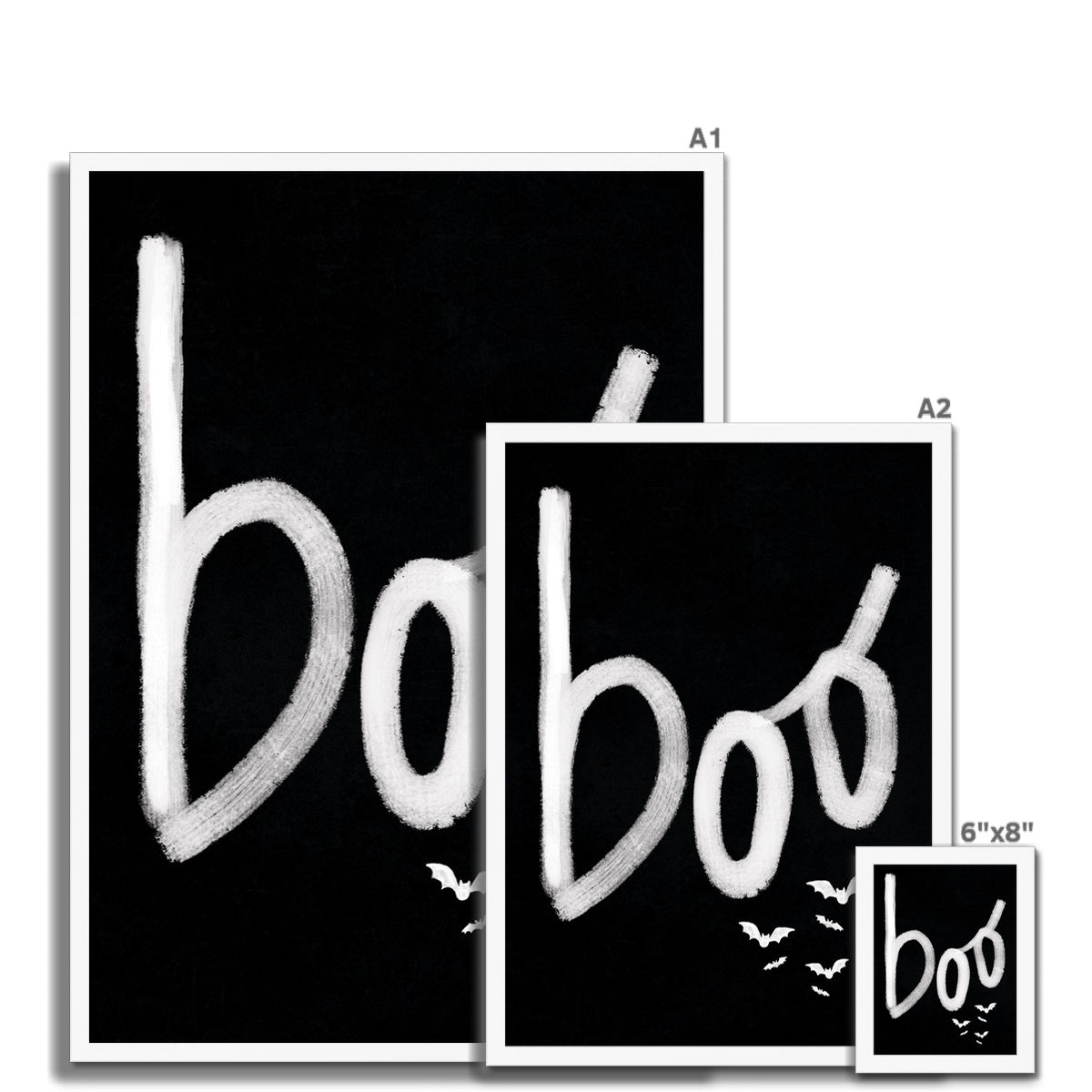 Our art print features a white hand drawn large 'boo' with bats underneath all in a gouche painted style, on a black slightly textured background. It is digitally printed by professional printers who are specialists in Giclée fine art printing.