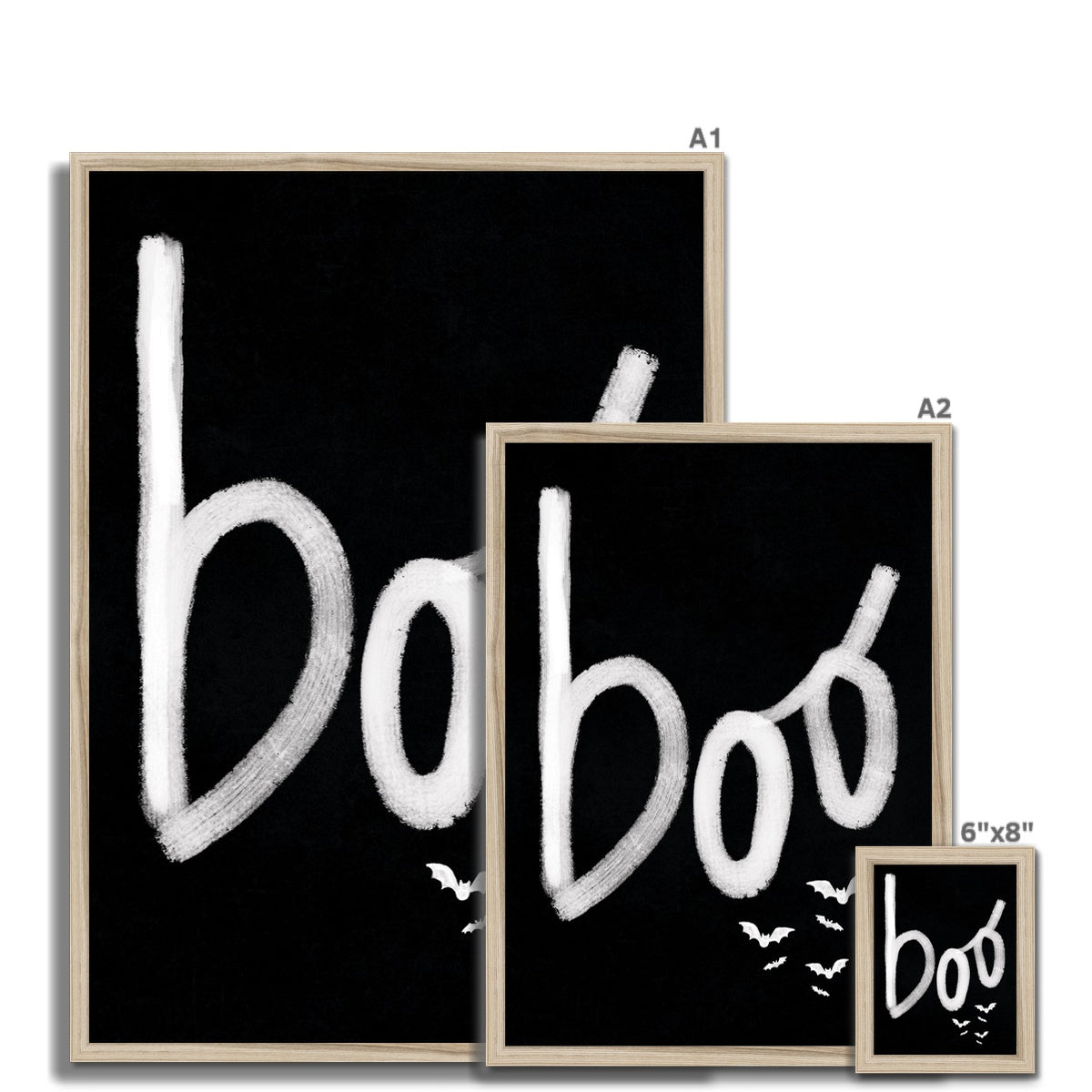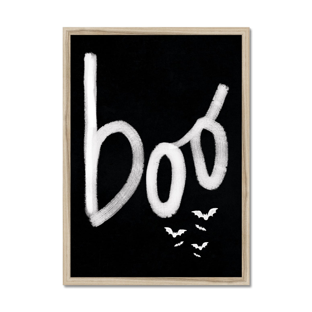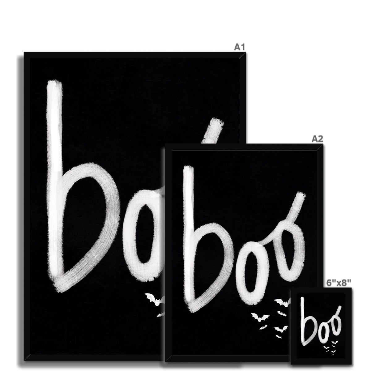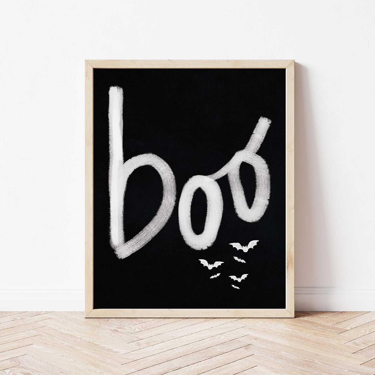 Our art print features a white hand drawn large 'boo' with bats underneath all in a gouche painted style, on a black slightly textured background. It is digitally printed by professional printers who are specialists in Giclée fine art printing.