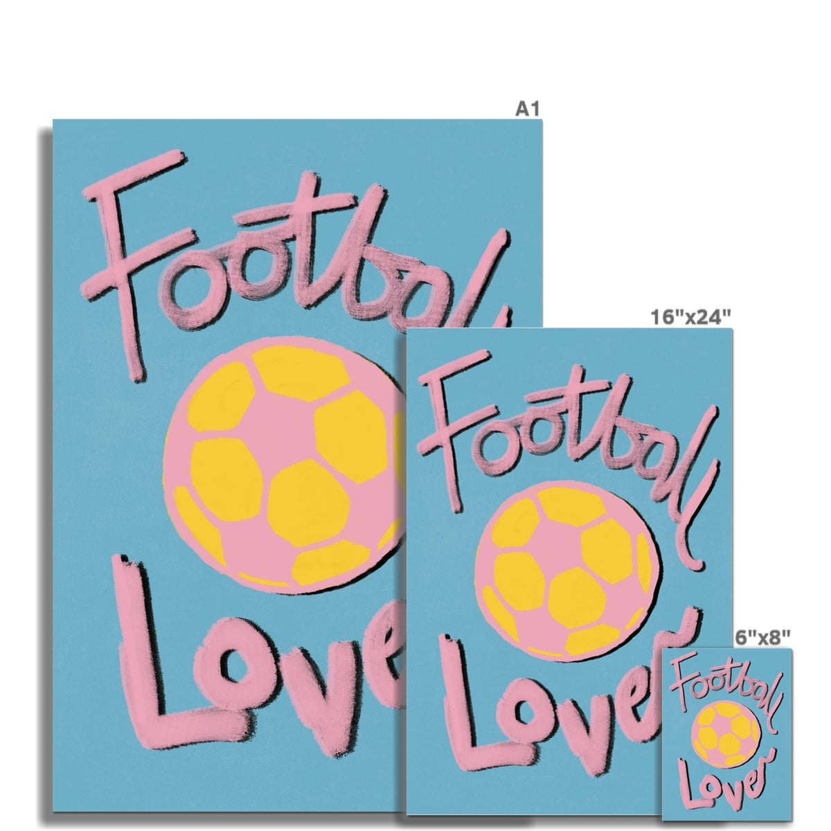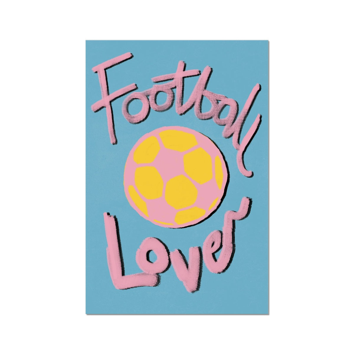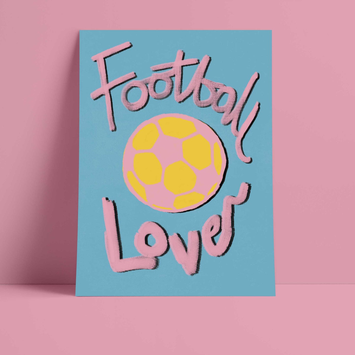 Our art print has the words 'football lover', hand lettered in a gouche painted style in pink and black, a bright pink and yellow football illustration with a blue textured background. It is digitally printed by professional printers who are specialists in Giclée fine art printing.
