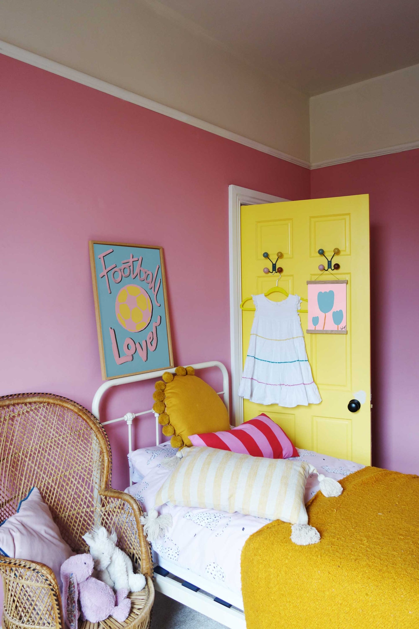 Does your child love football? But do you not love the traditional football kit colours usually used on prints? Well this print was made to bride the gap between embracing your child's love for football whilst also being in colours that suit their bedroom decor. Each print in our 'love' collection comes with a variety of colour palettes not normally associated with the subject (i.e. pink and yellow for football) so you can still match your child's lovely room decor. Let us know if child's bedroom colours are missing and we'll add it for you!
