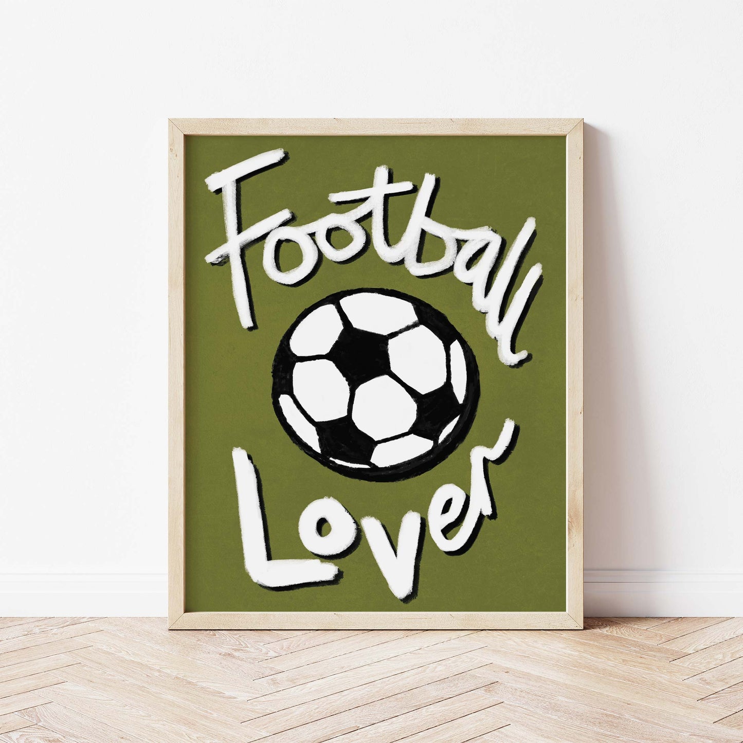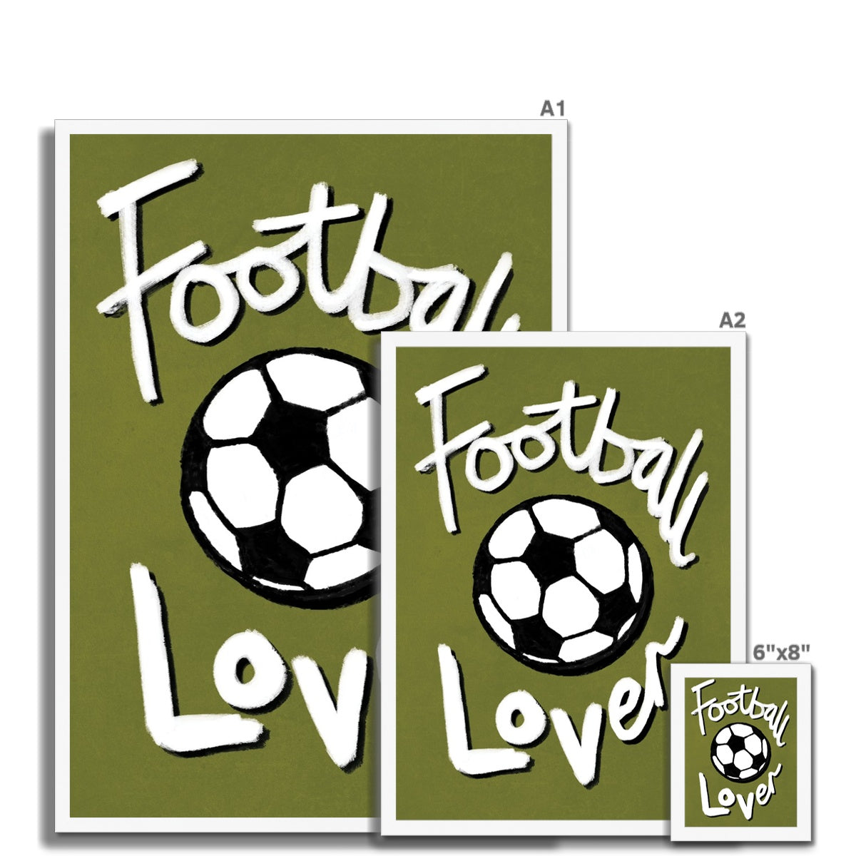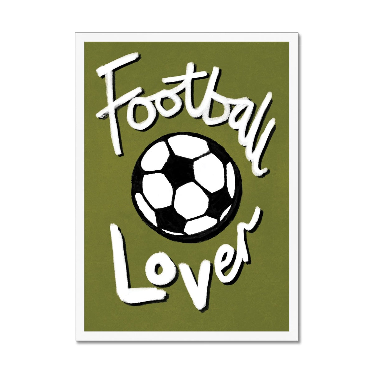 Our art print has the words 'football lover', hand lettered in a gouche painted style in white and black, a white and black football illustration with an olive green textured background. It is digitally printed by professional printers who are specialists in Giclée fine art printing.