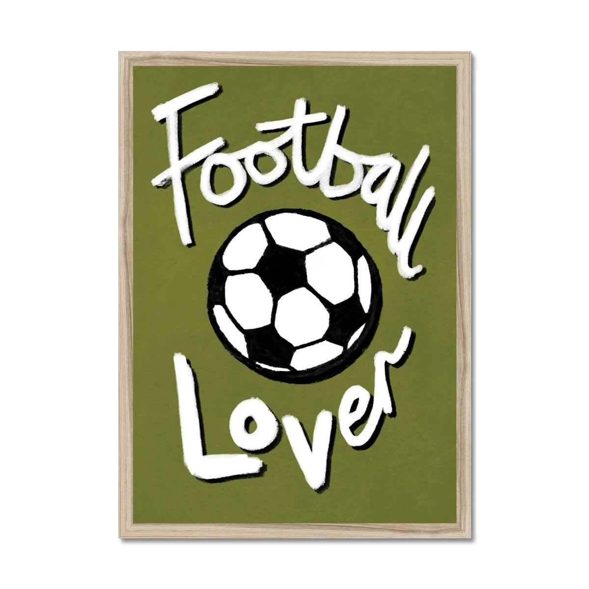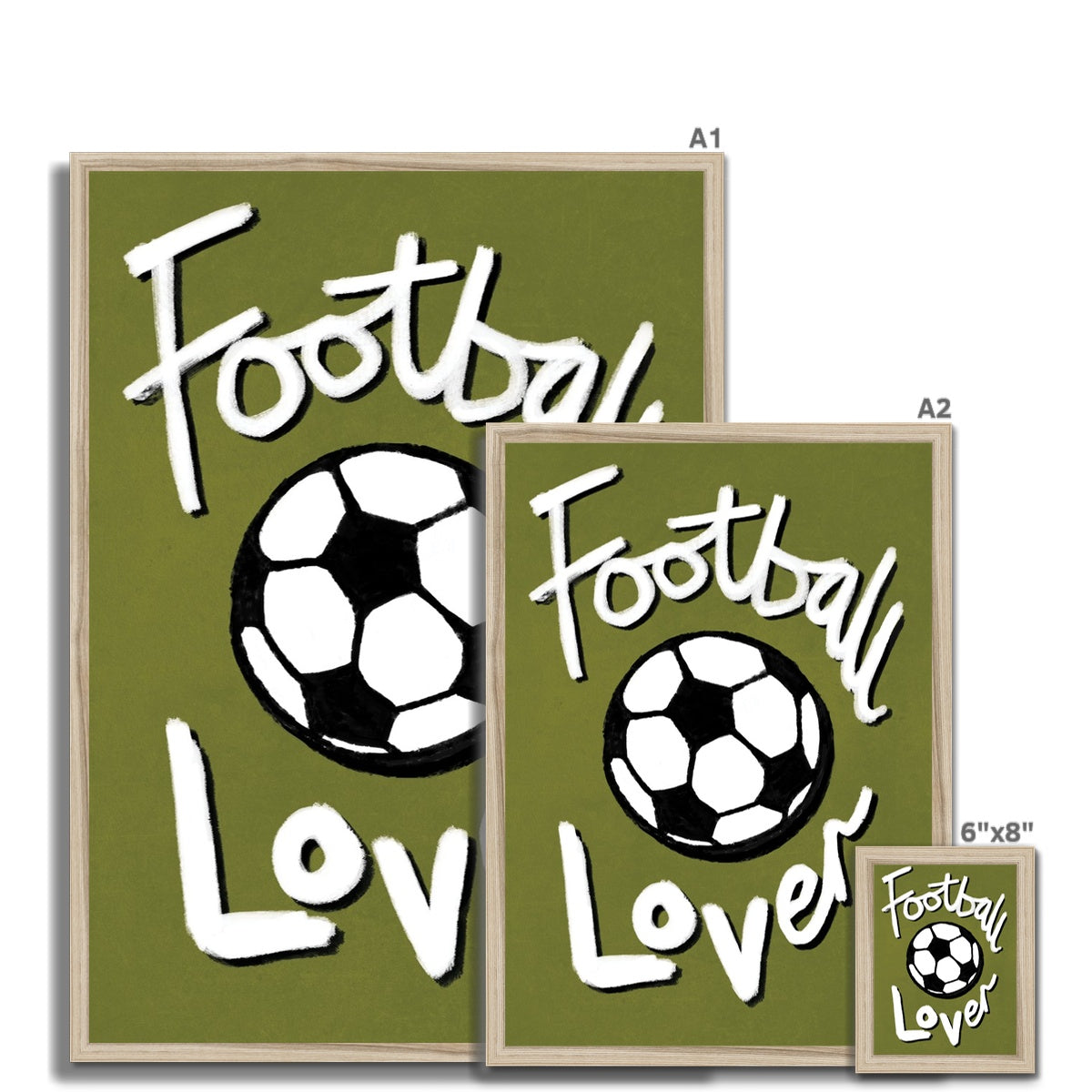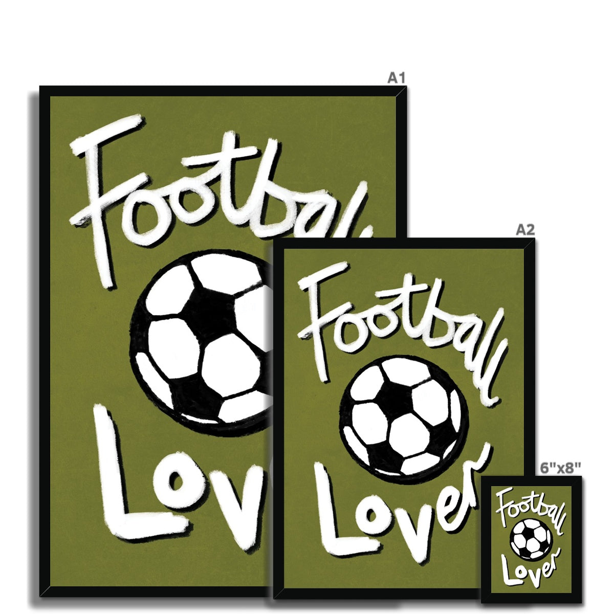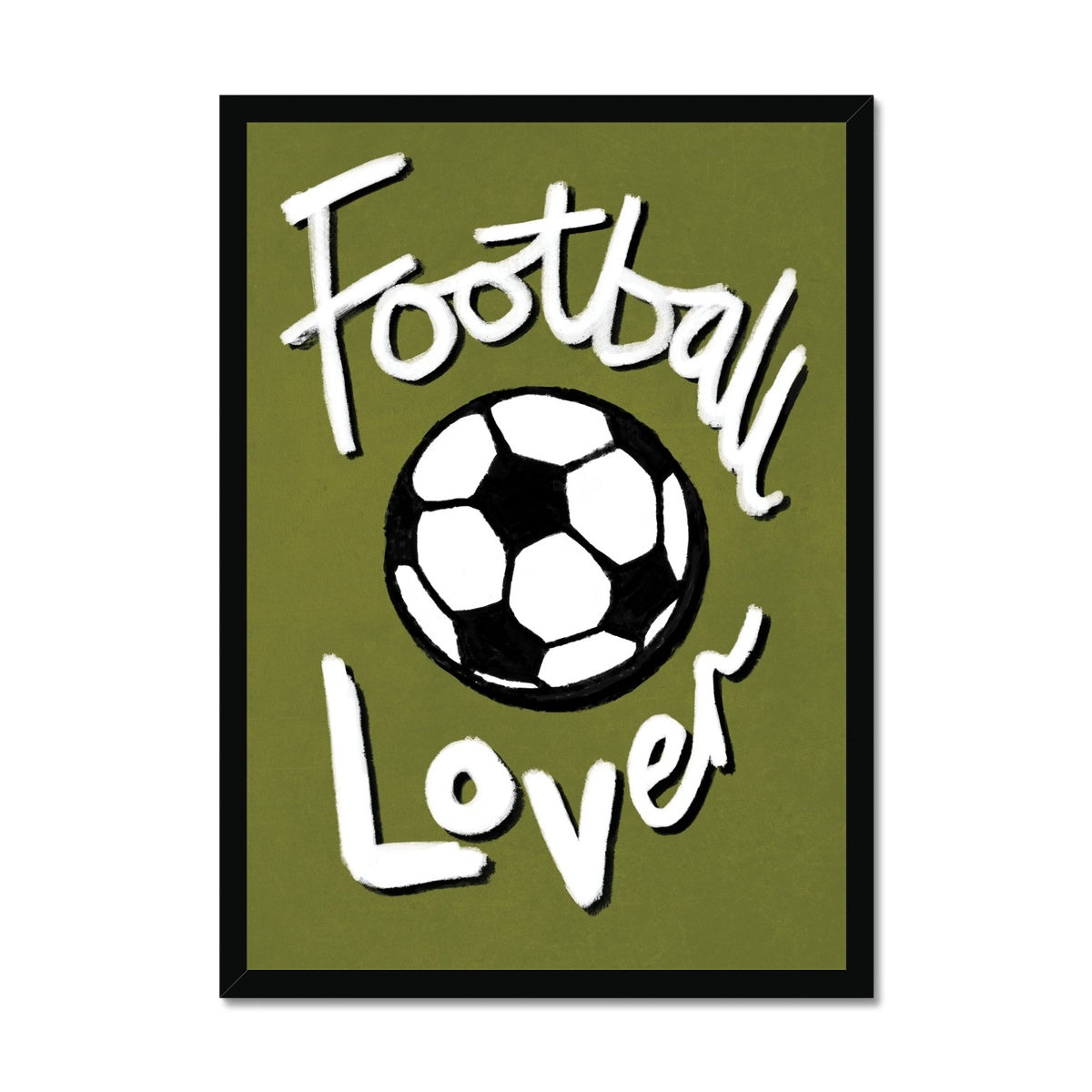 Our art print has the words 'football lover', hand lettered in a gouche painted style in white and black, a white and black football illustration with an olive green textured background. It is digitally printed by professional printers who are specialists in Giclée fine art printing.