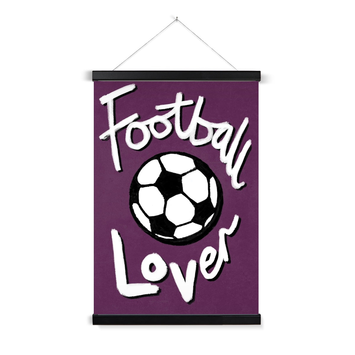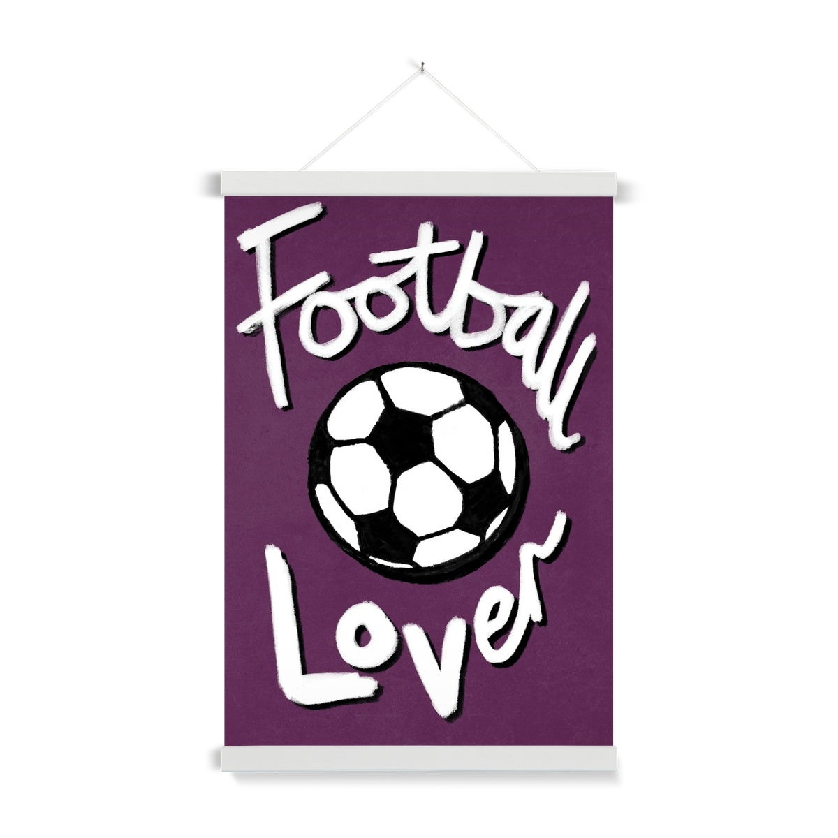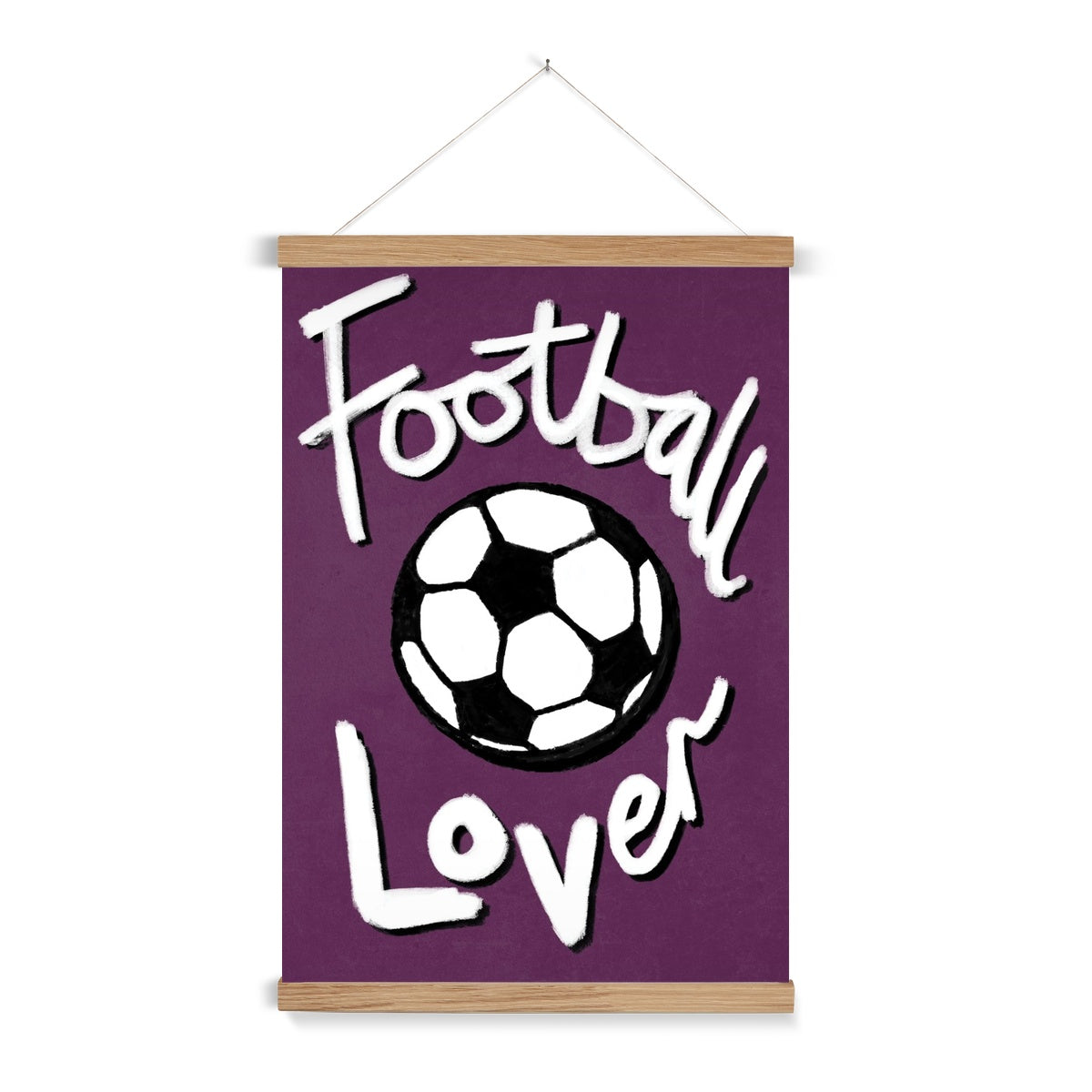 Our art print has the words 'football lover', hand lettered in a gouche painted style in white and black, a white and black football illustration with a purple, plum textured background. It is digitally printed by professional printers who are specialists in Giclée fine art printing.