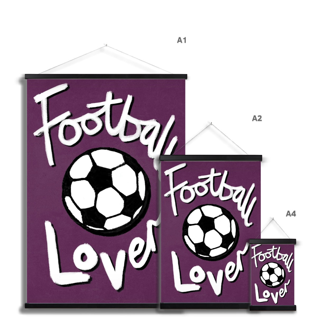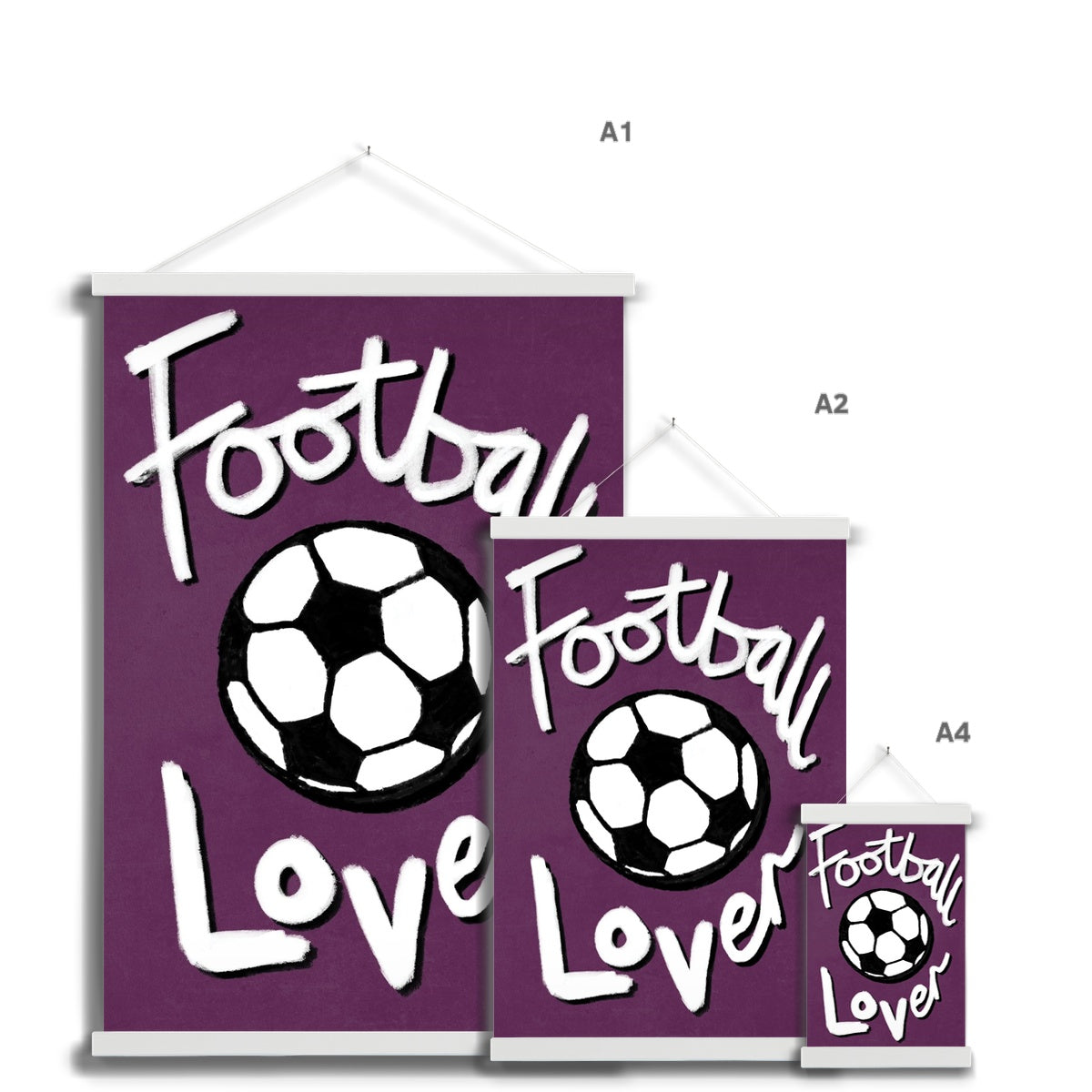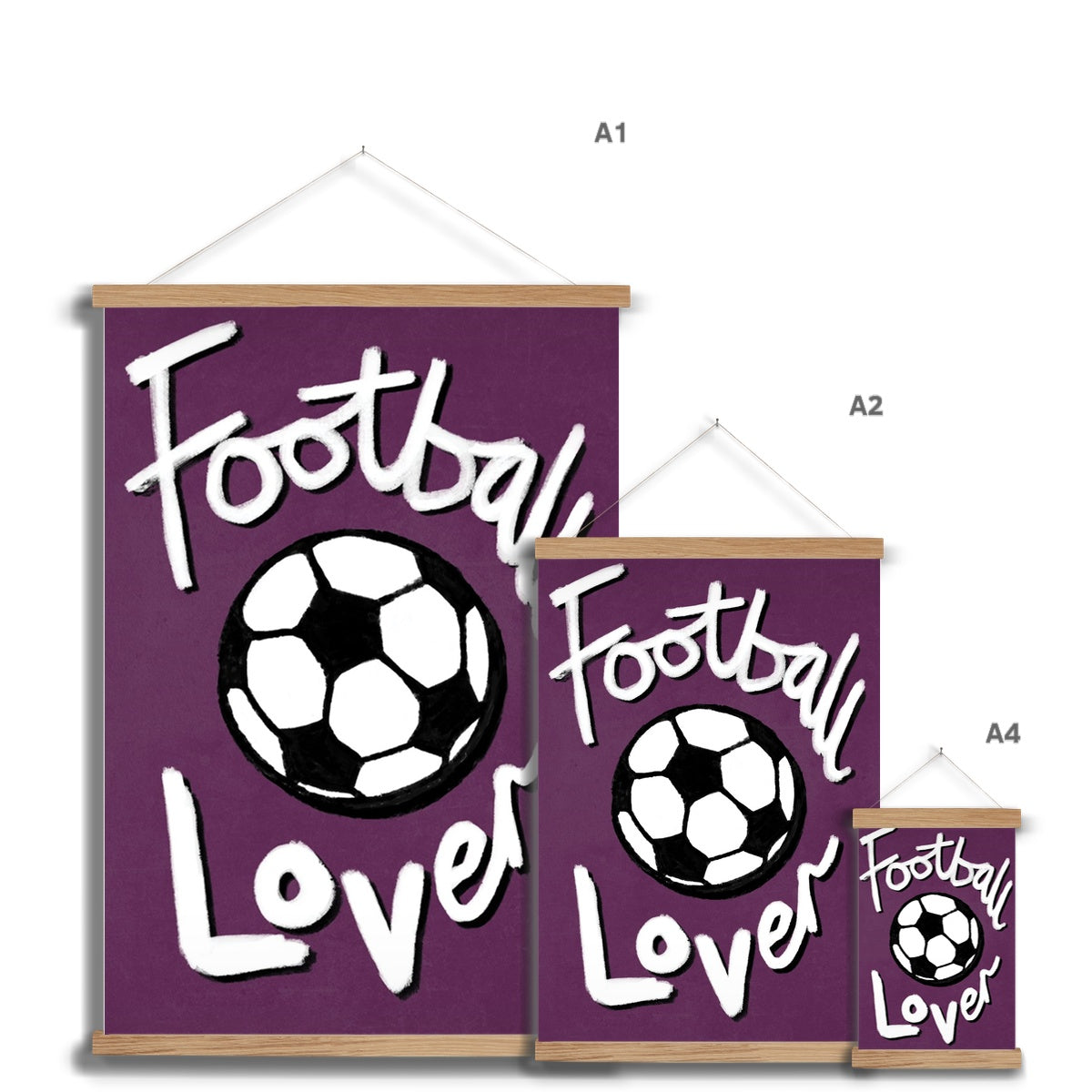 Our art print has the words 'football lover', hand lettered in a gouche painted style in white and black, a white and black football illustration with a purple, plum textured background. It is digitally printed by professional printers who are specialists in Giclée fine art printing.
