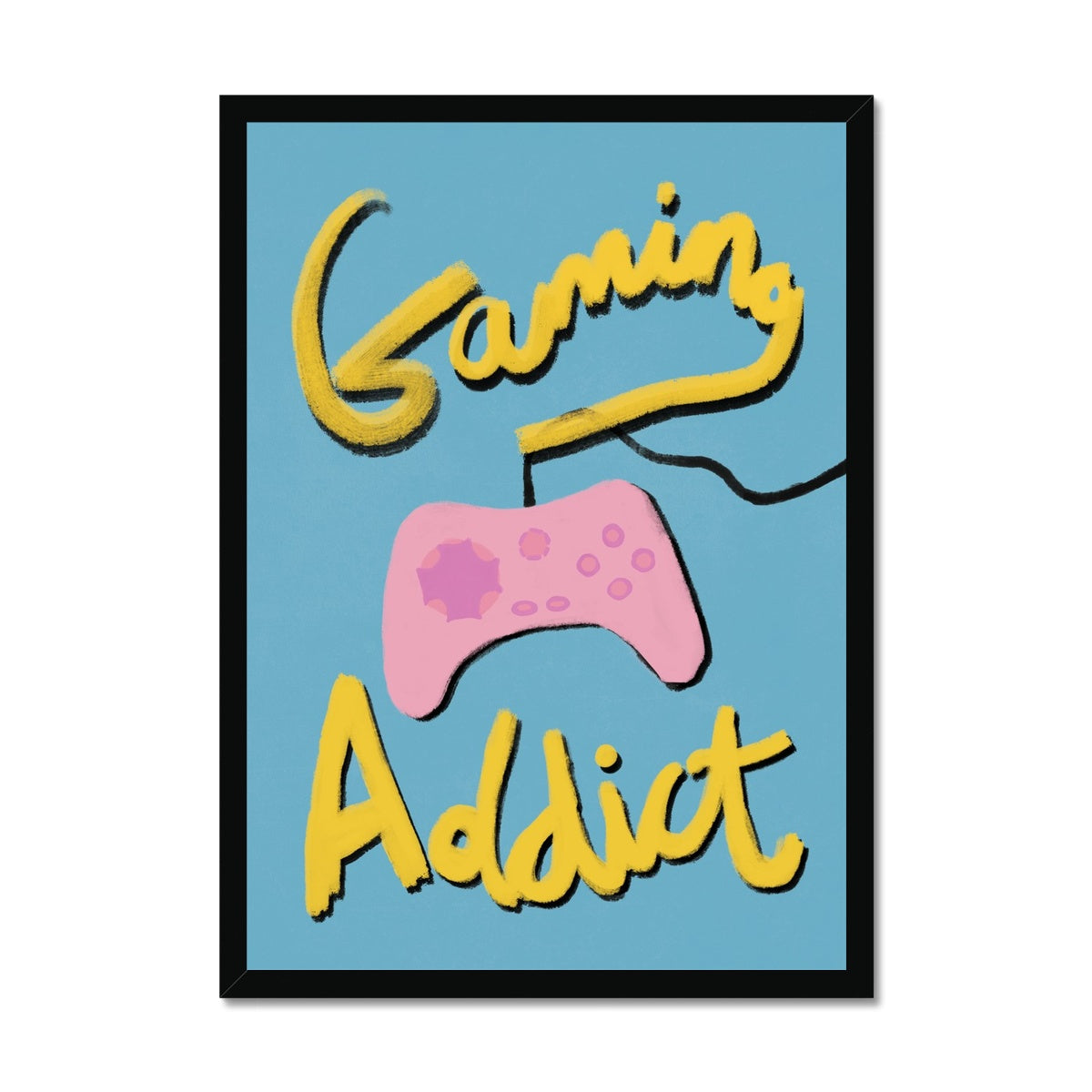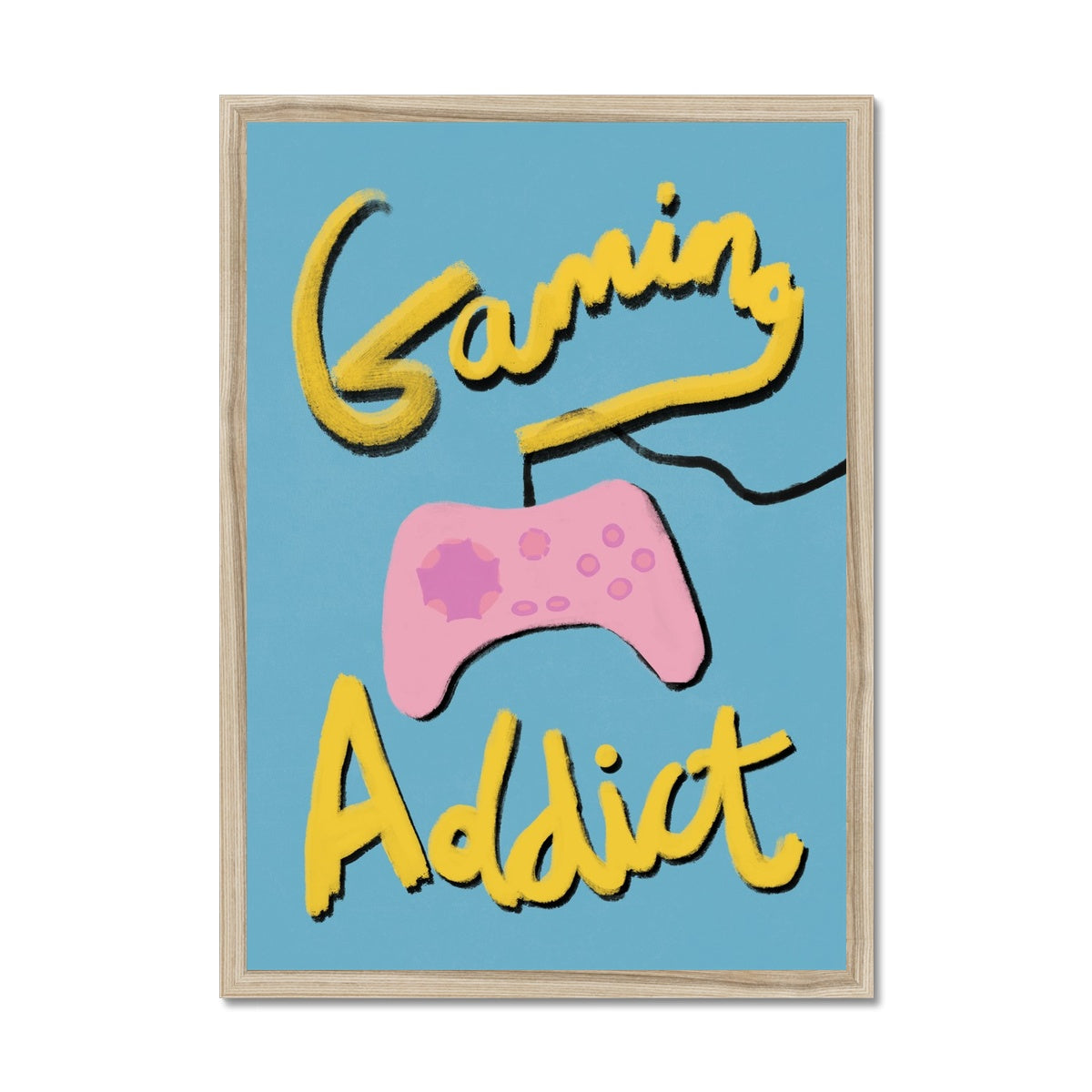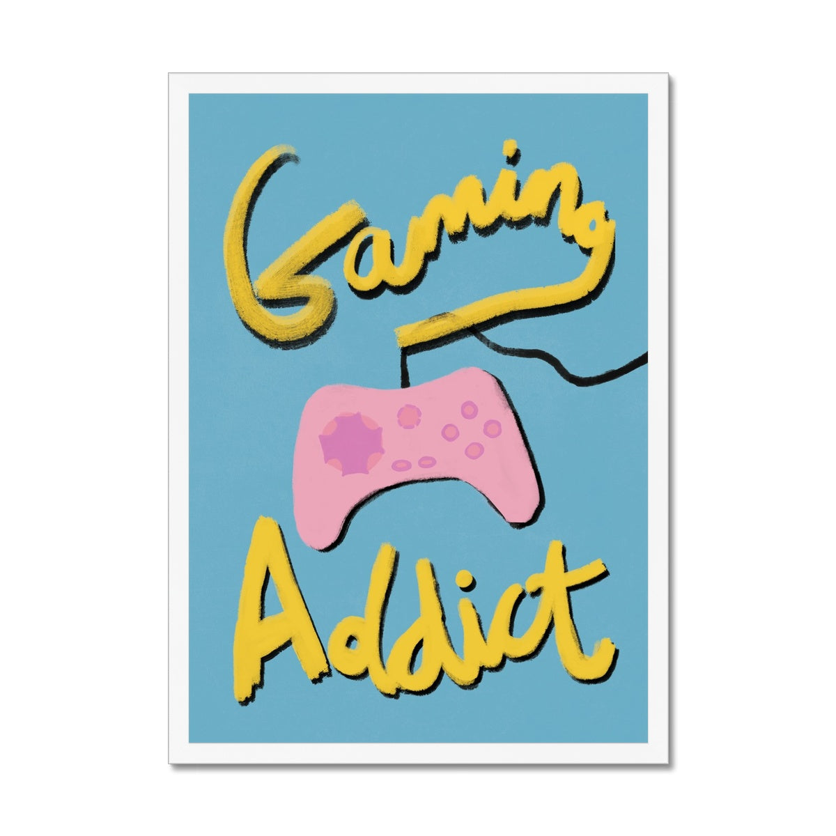 Our art print has the words 'gaming addict', hand lettered in a gouche painted style in yellow and black, a pink gaming console illustration with a blue textured background. It is digitally printed by professional printers who are specialists in Giclée fine art printing.