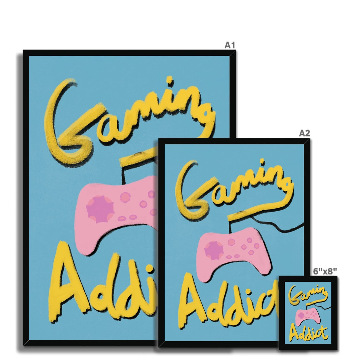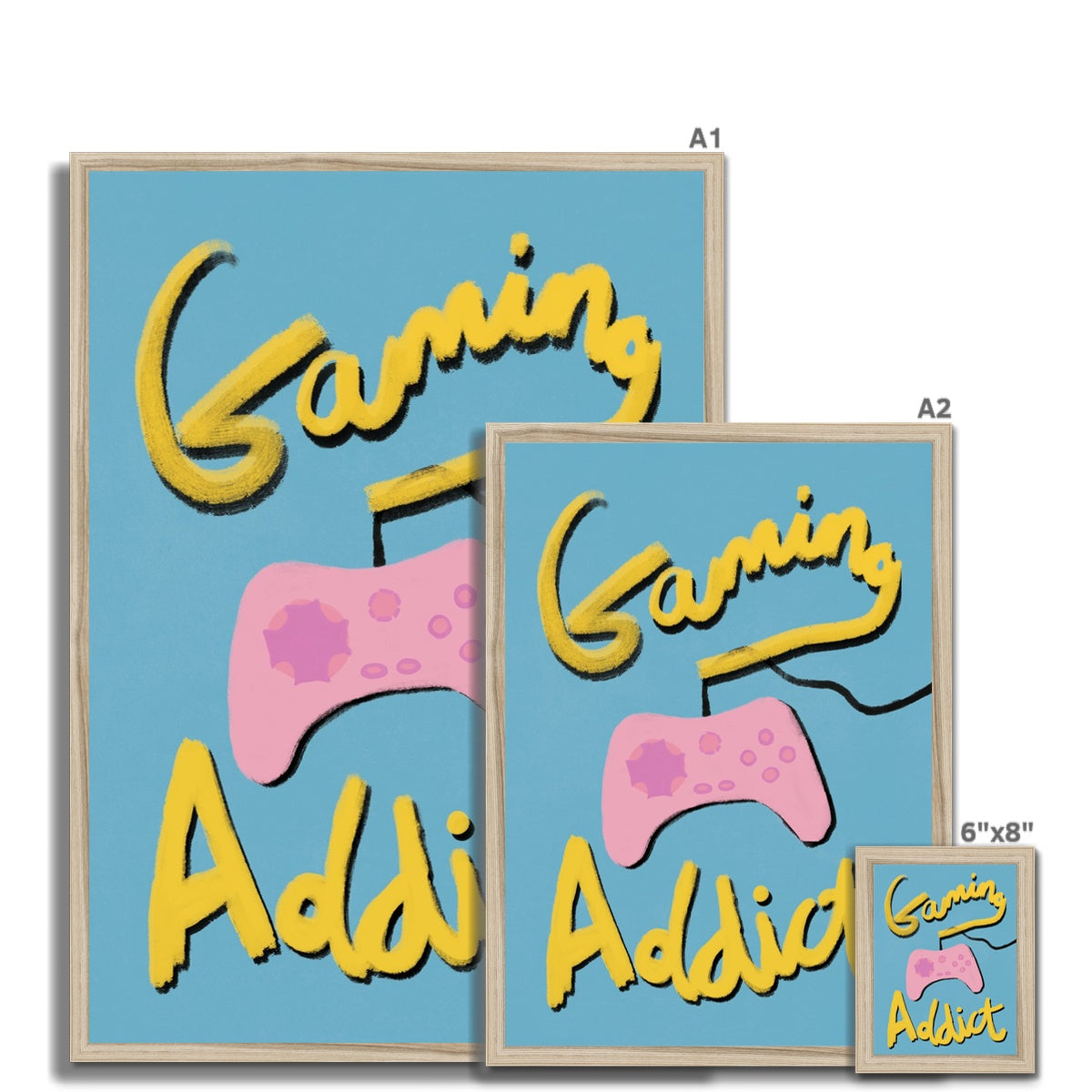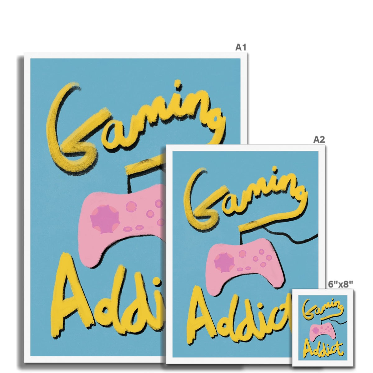 Our art print has the words 'gaming addict', hand lettered in a gouche painted style in yellow and black, a pink gaming console illustration with a blue textured background. It is digitally printed by professional printers who are specialists in Giclée fine art printing.