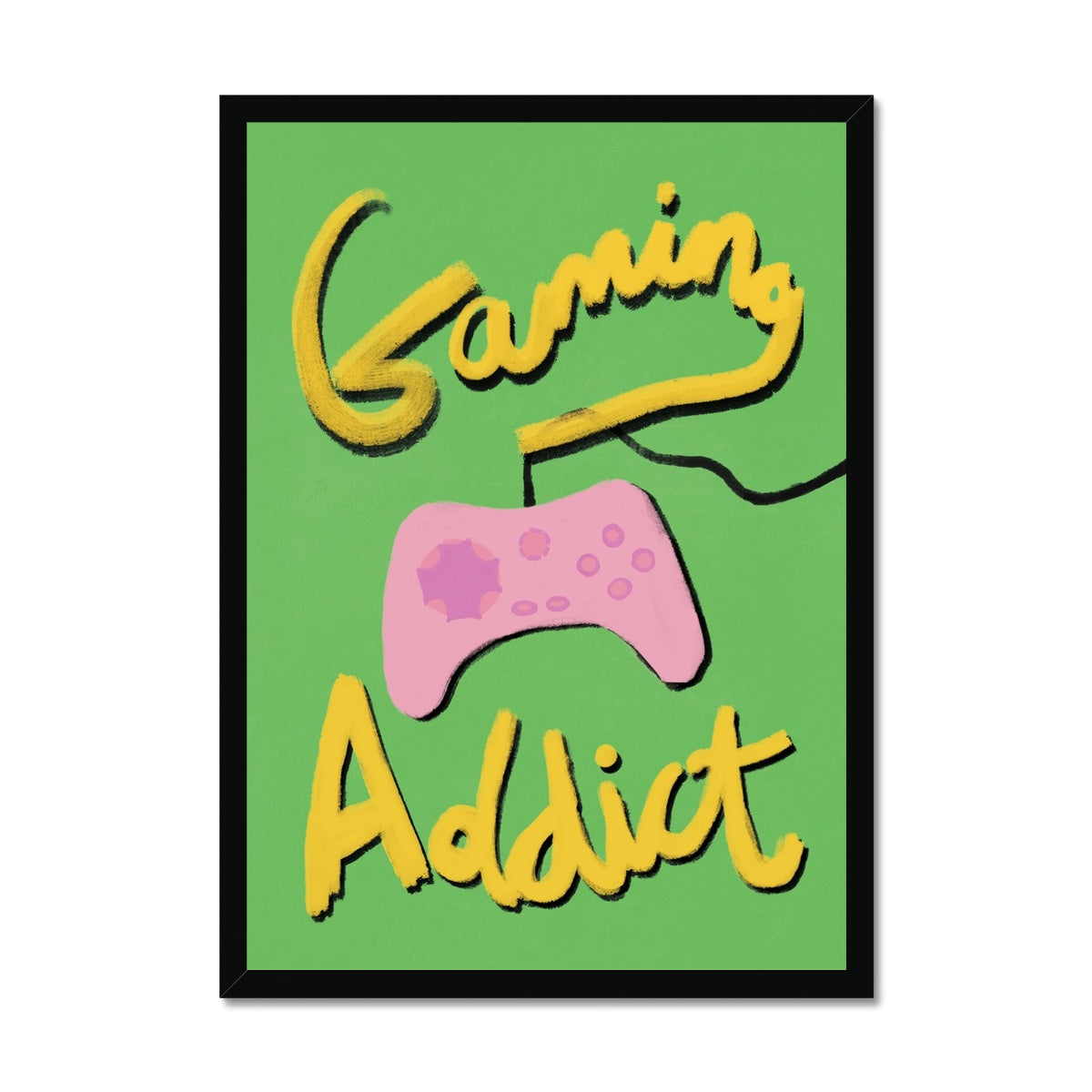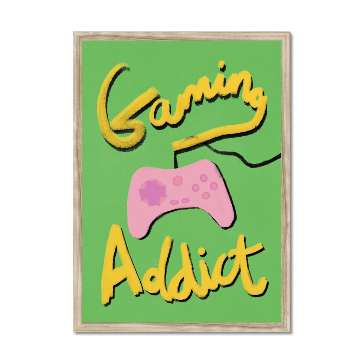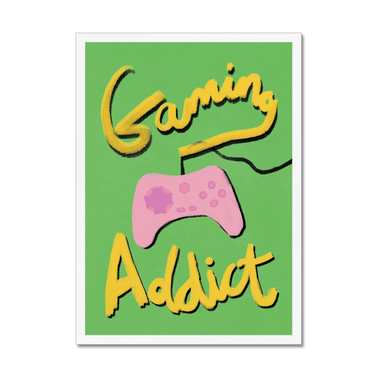 Our art print has the words 'gaming addict', hand lettered in a gouche painted style in yellow and black, a pink gaming console illustration with a green textured background. It is digitally printed by professional printers who are specialists in Giclée fine art printing.