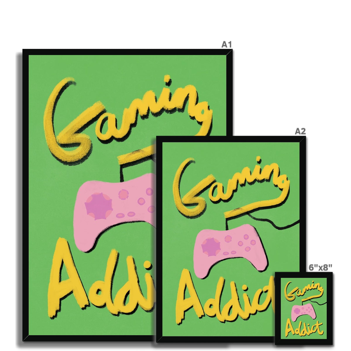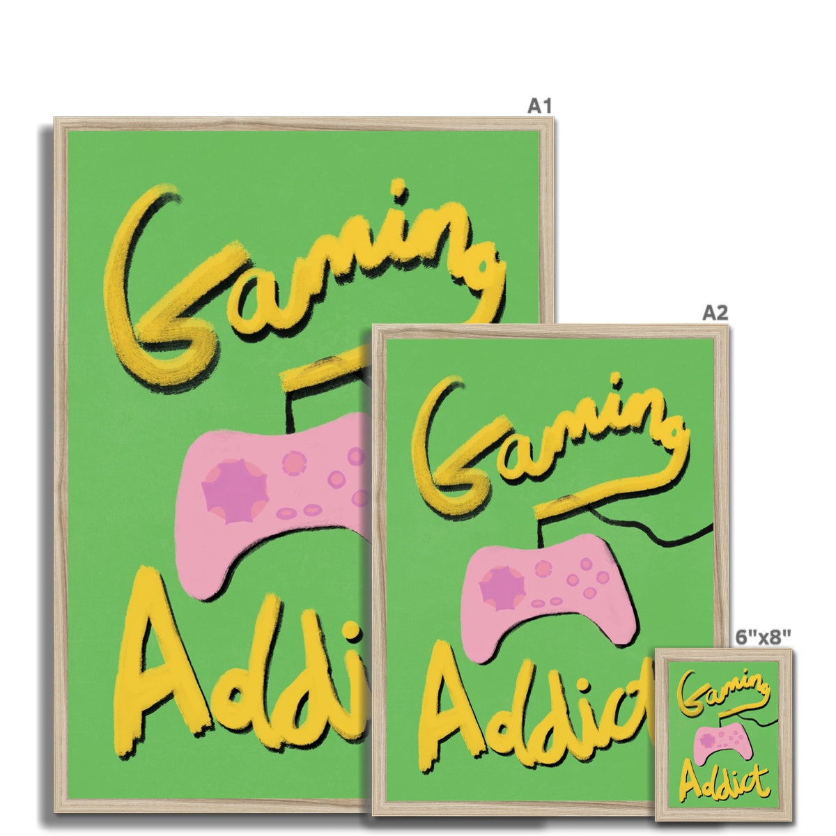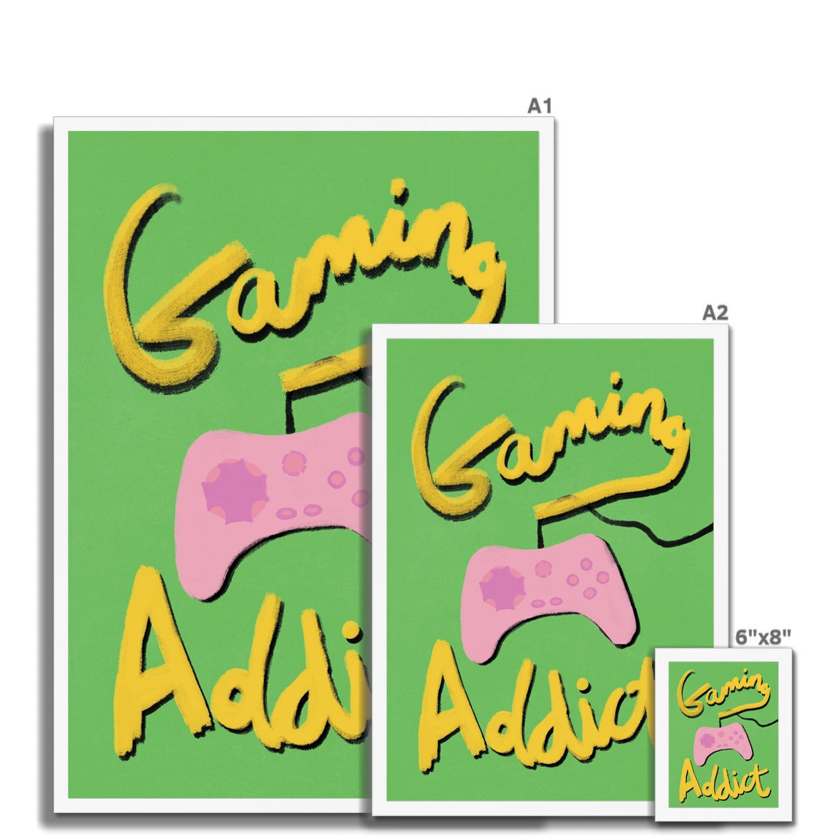 Our art print has the words 'gaming addict', hand lettered in a gouche painted style in yellow and black, a pink gaming console illustration with a green textured background. It is digitally printed by professional printers who are specialists in Giclée fine art printing.