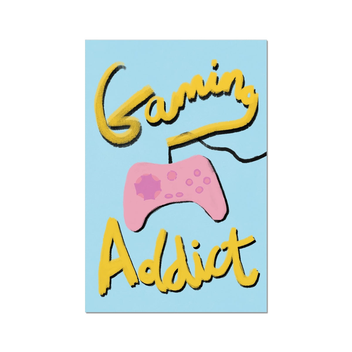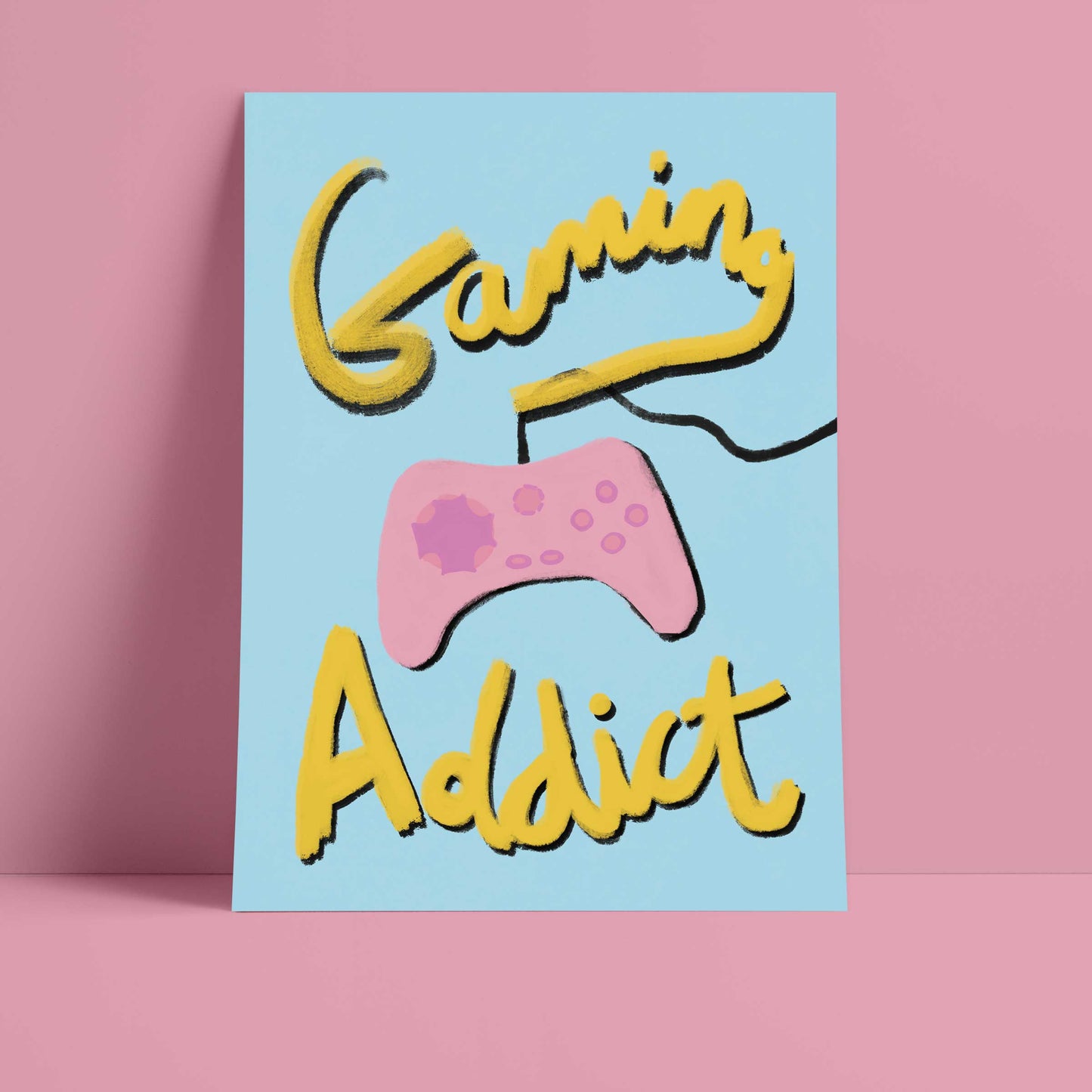 Our art print has the words 'gaming addict', hand lettered in a gouche painted style in yellow and black, a pink gaming console illustration with a light blue textured background. It is digitally printed by professional printers who are specialists in Giclée fine art printing.