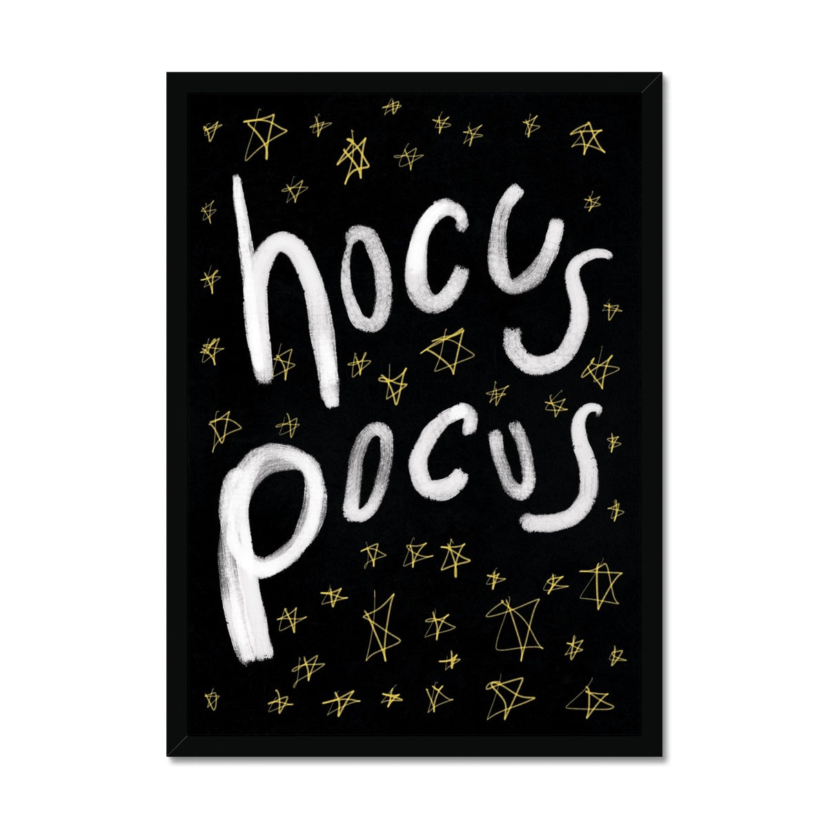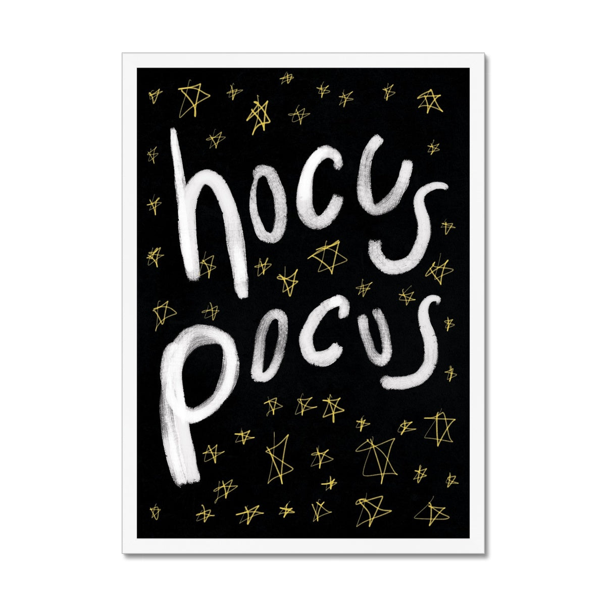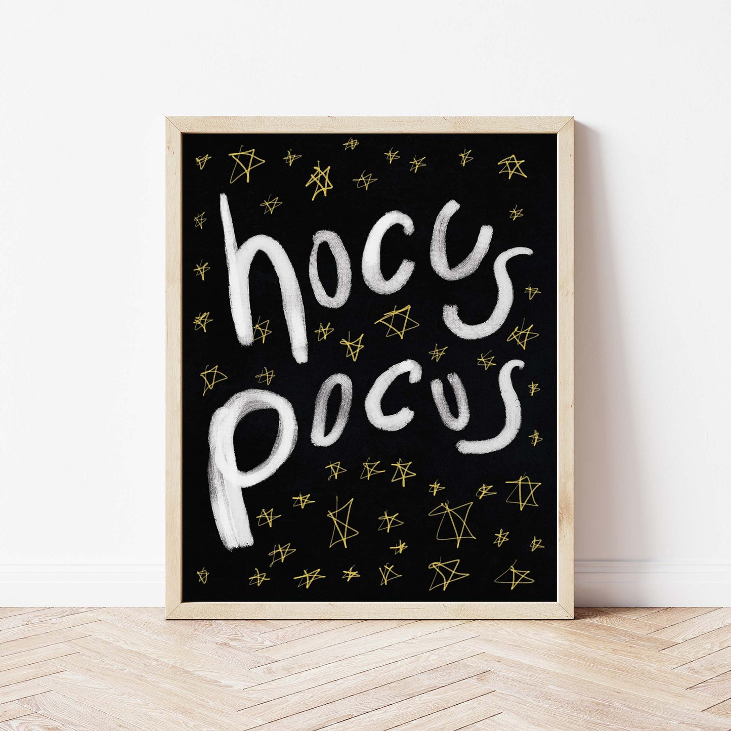 Our art print features hand drawn yellow stars with the words 'hocus pocus' in a gouche painted style, on a black textured background. It is digitally printed by professional printers who are specialists in Giclée fine art printing and has the hand written words 'you can do it' in black in the right hand corner.