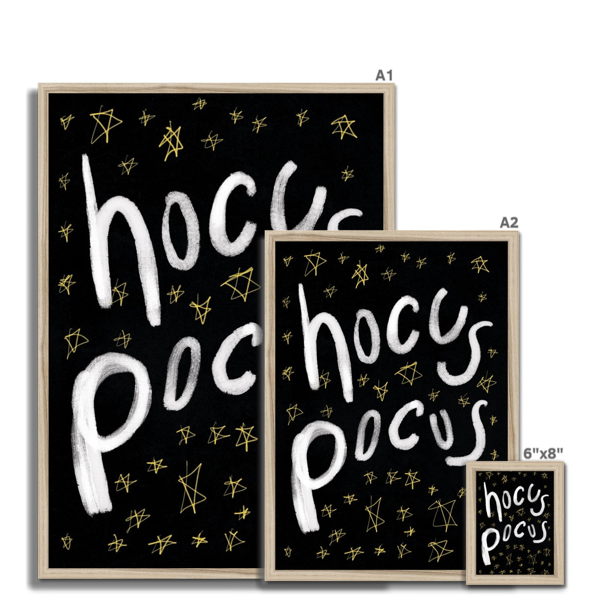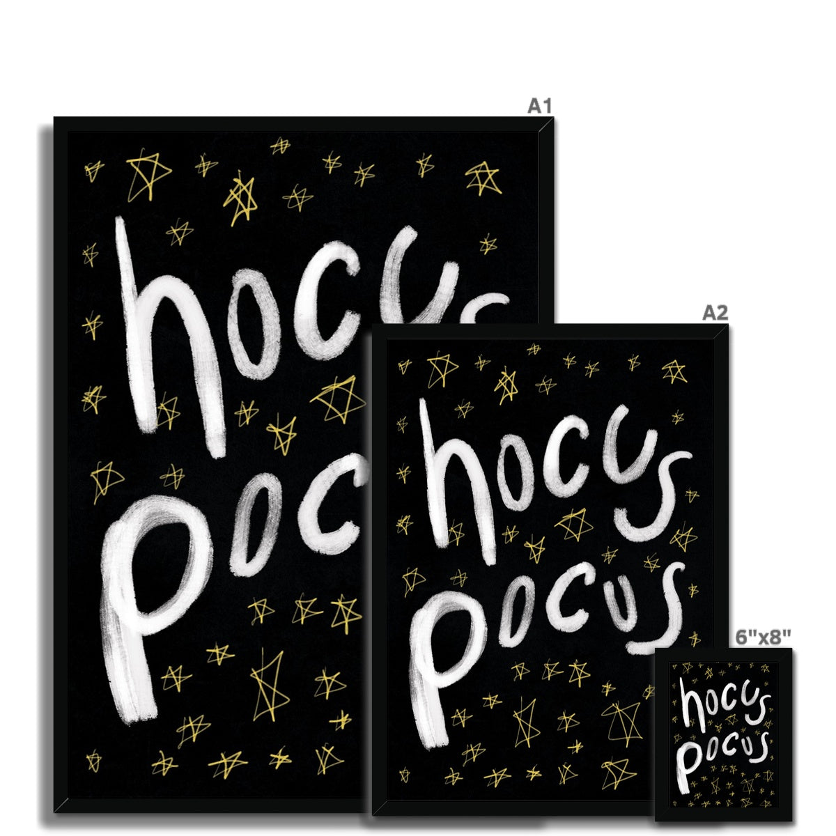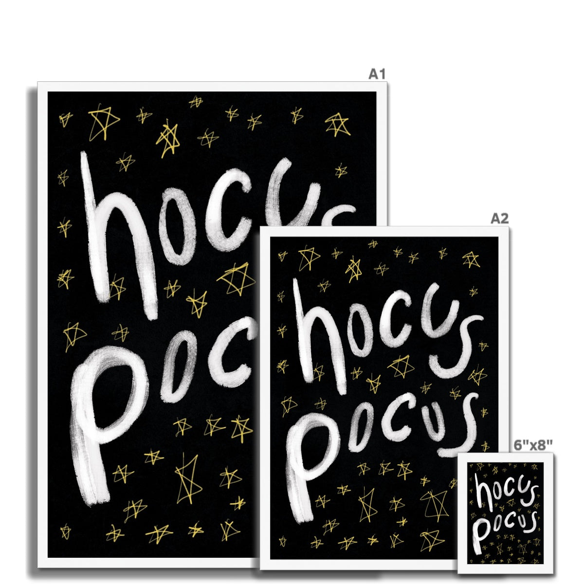 Our art print features hand drawn yellow stars with the words 'hocus pocus' in a gouche painted style, on a black textured background. It is digitally printed by professional printers who are specialists in Giclée fine art printing and has the hand written words 'you can do it' in black in the right hand corner.