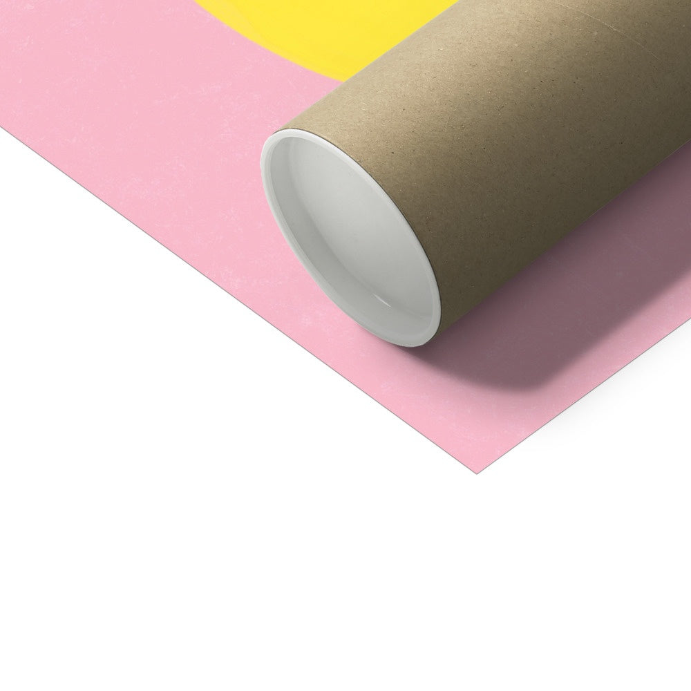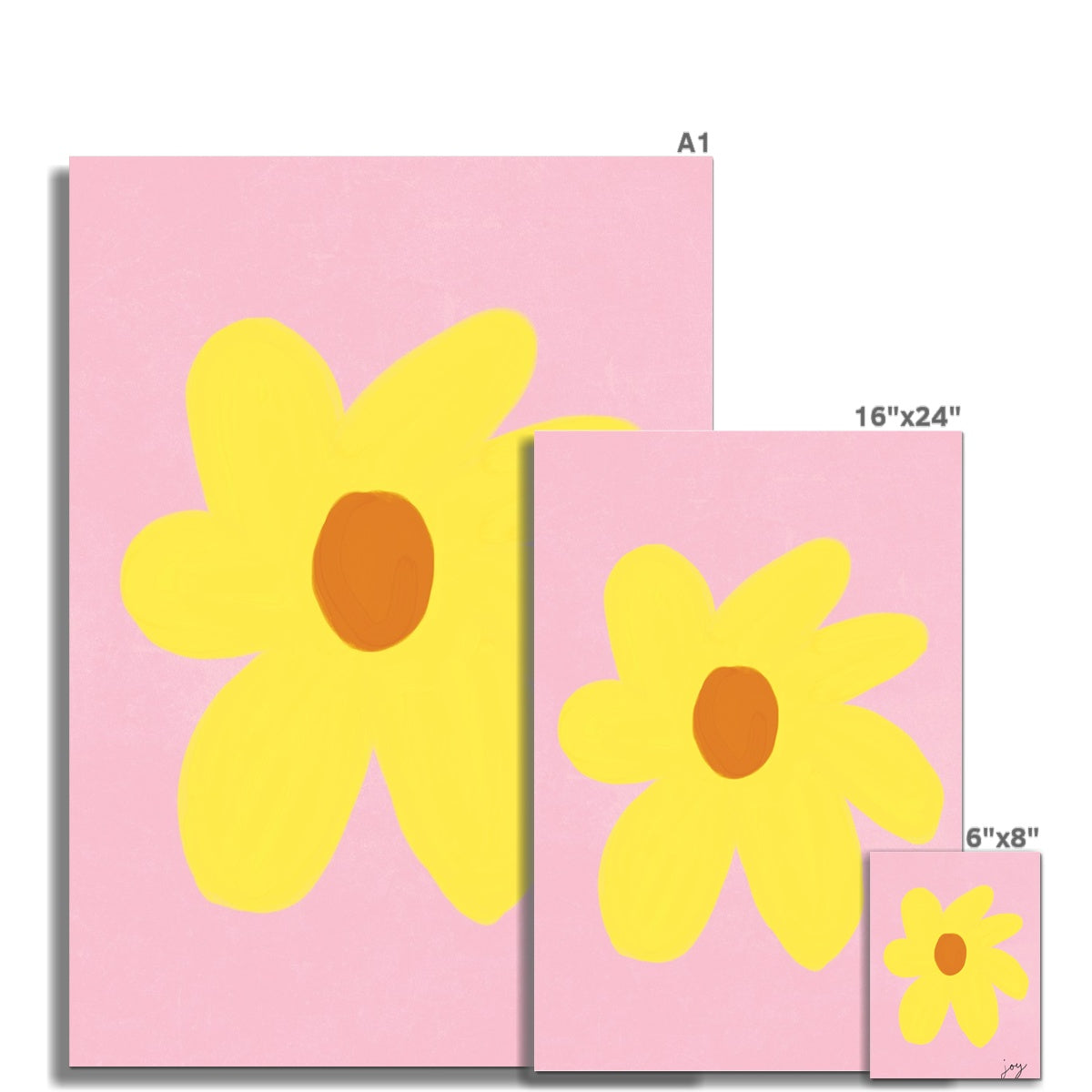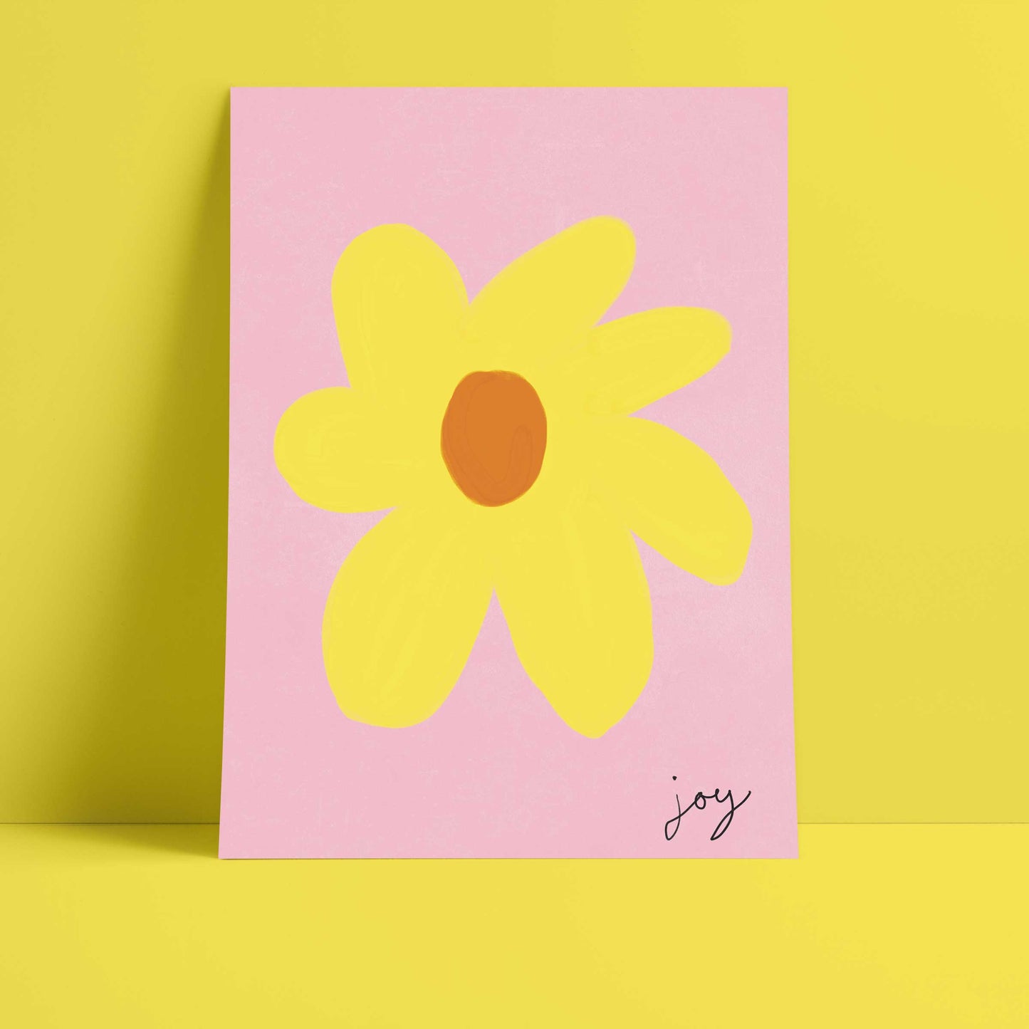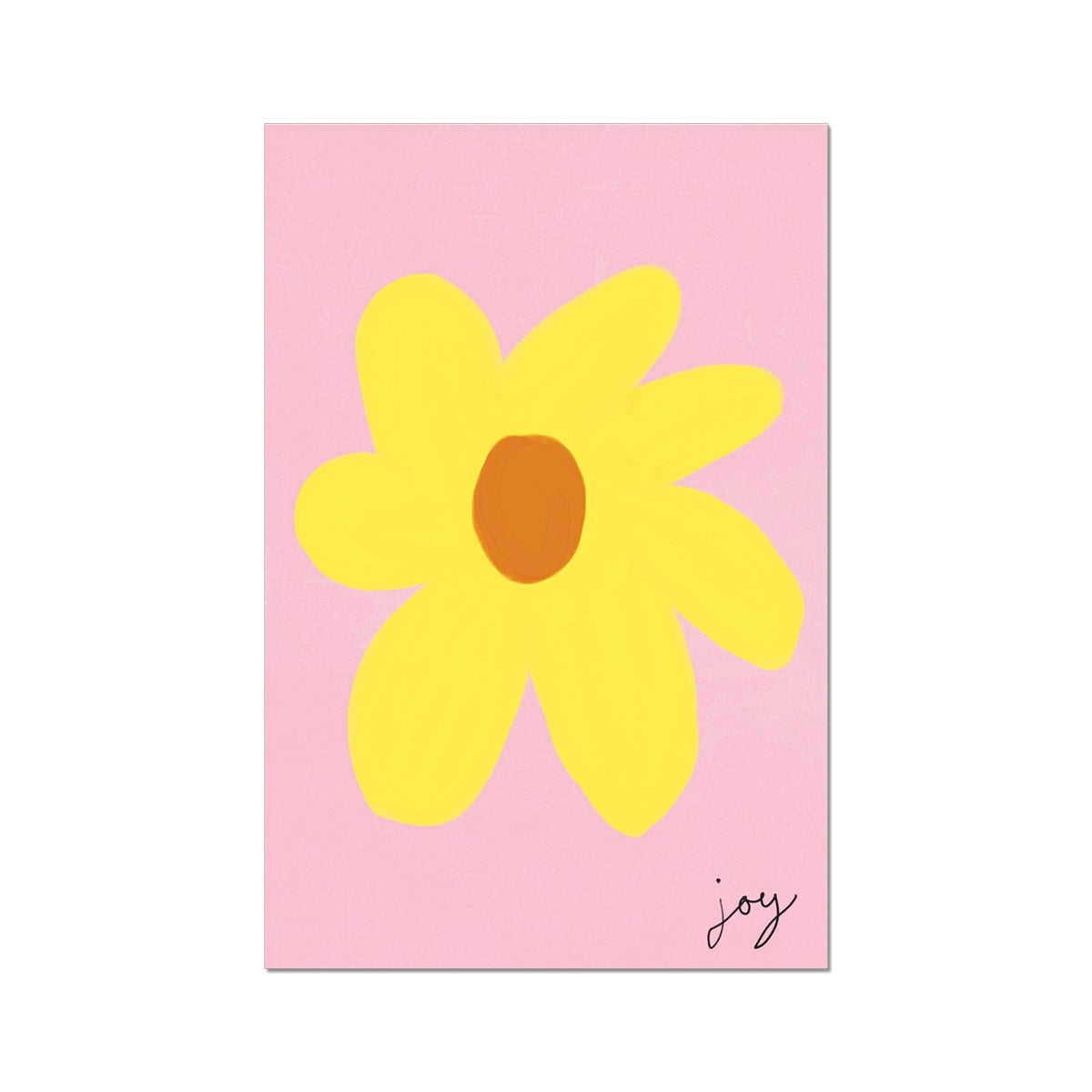 Our art print features a simple hand drawn floral in a yellow and light brown gouche painted style, on a pink textured background. It is digitally printed by professional printers who are specialists in Giclée fine art printing and features the hand drawn word 'joy' in black in the right hand corner.