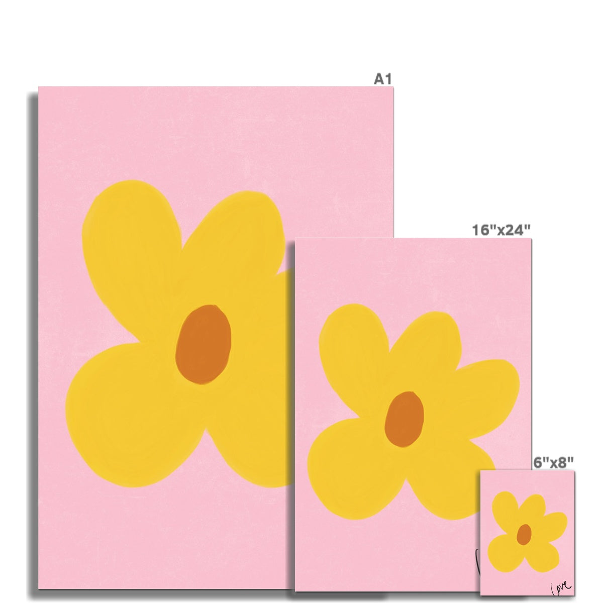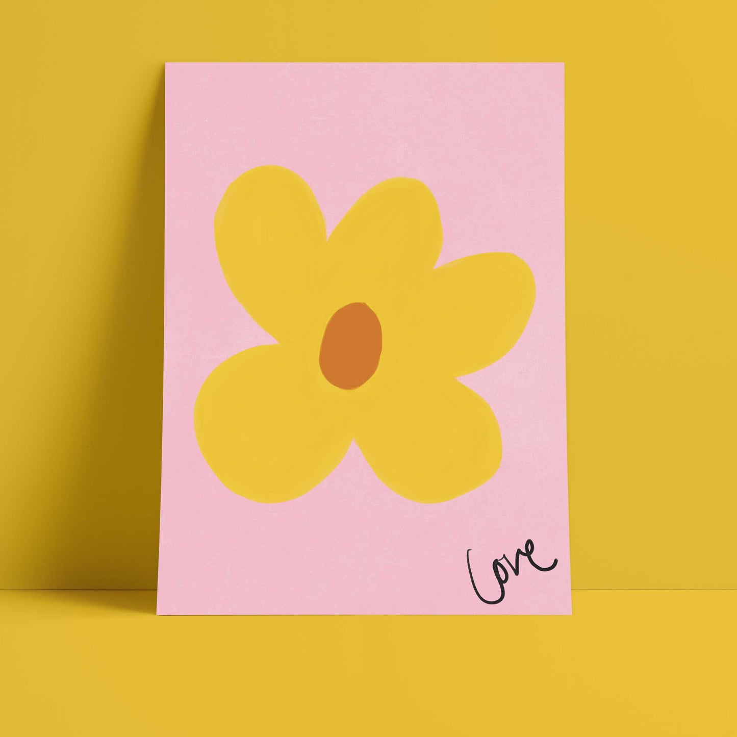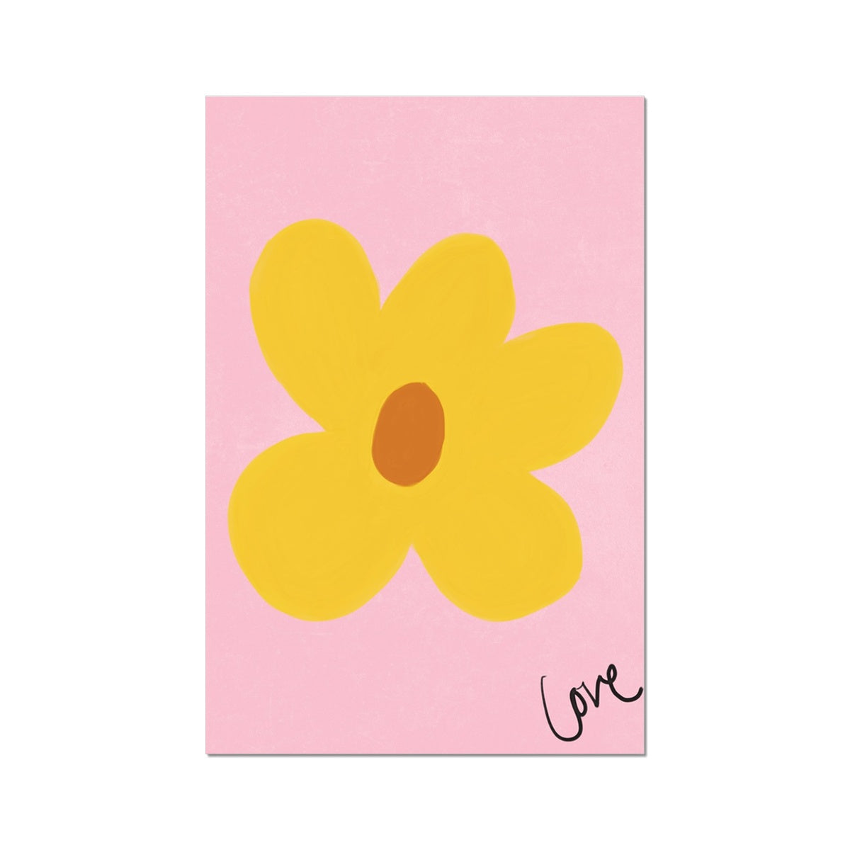 Our art print features a hand drawn flower in a yellow and brown gouche painted style, on a pink textured background. It is digitally printed by professional printers who are specialists in Giclée fine art printing and features the hand drawn word 'love' in black in the right hand corner.
