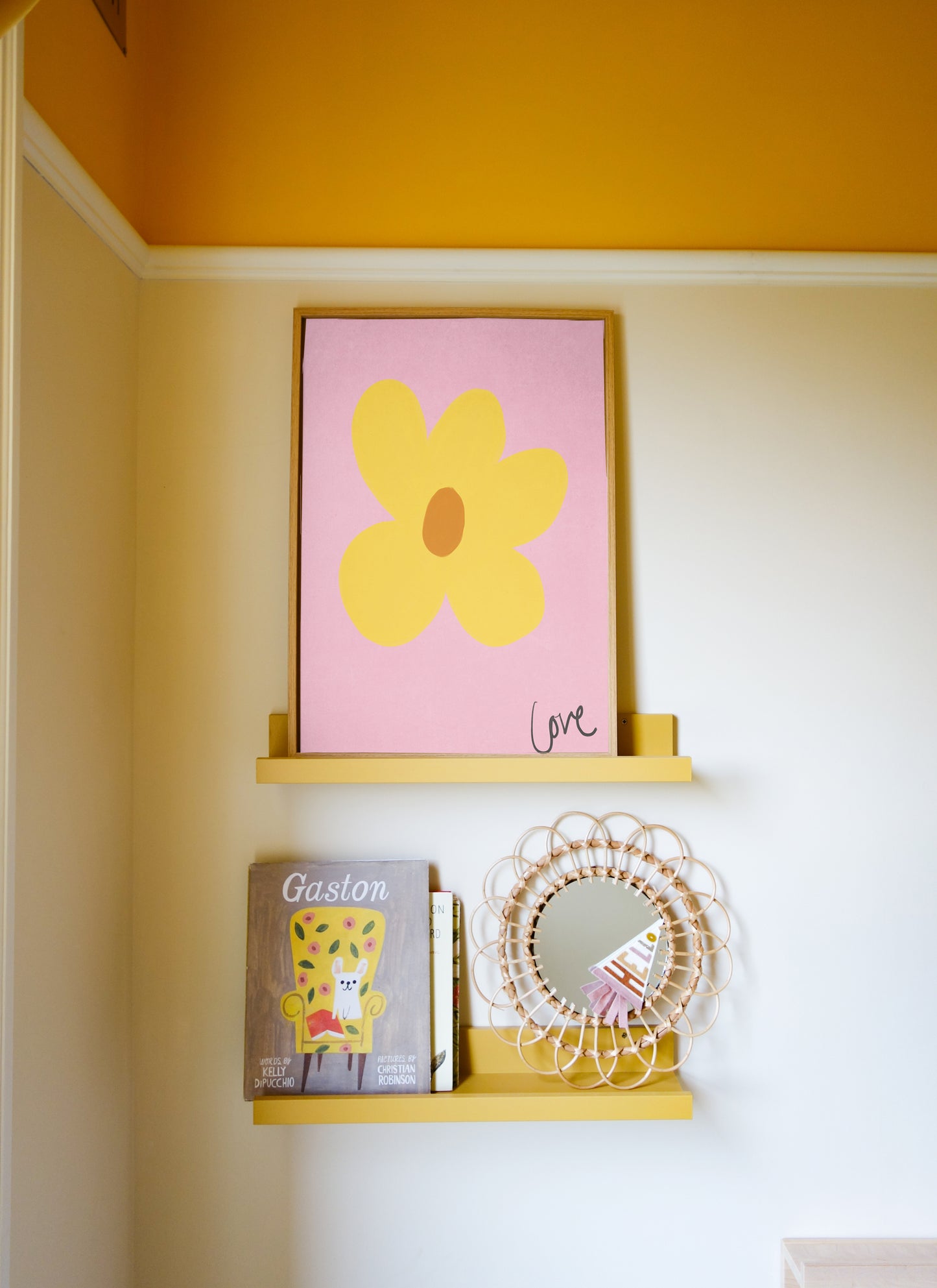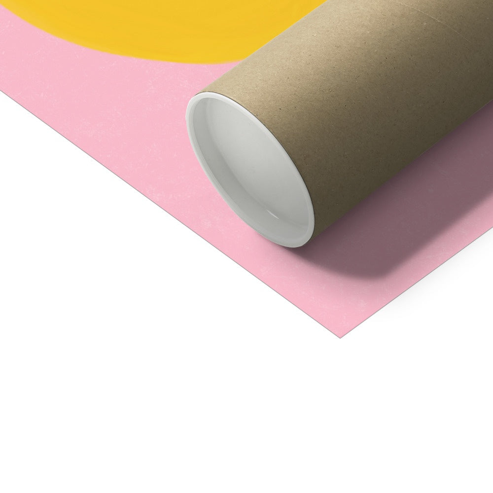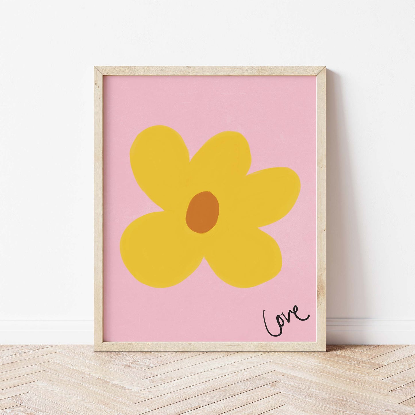 Our art print features a hand drawn flower in a yellow and brown gouche painted style, on a pink textured background. It is digitally printed by professional printers who are specialists in Giclée fine art printing and features the hand drawn word 'love' in black in the right hand corner.