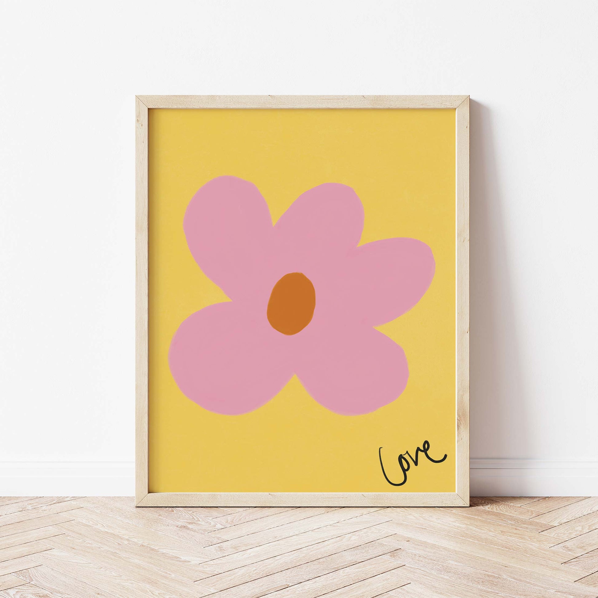 Our art print features a hand drawn flower in a pink and brown gouche painted style, on a yellow textured background. It is digitally printed by professional printers who are specialists in Giclée fine art printing and features the hand drawn word 'love' in black in the right hand corner.