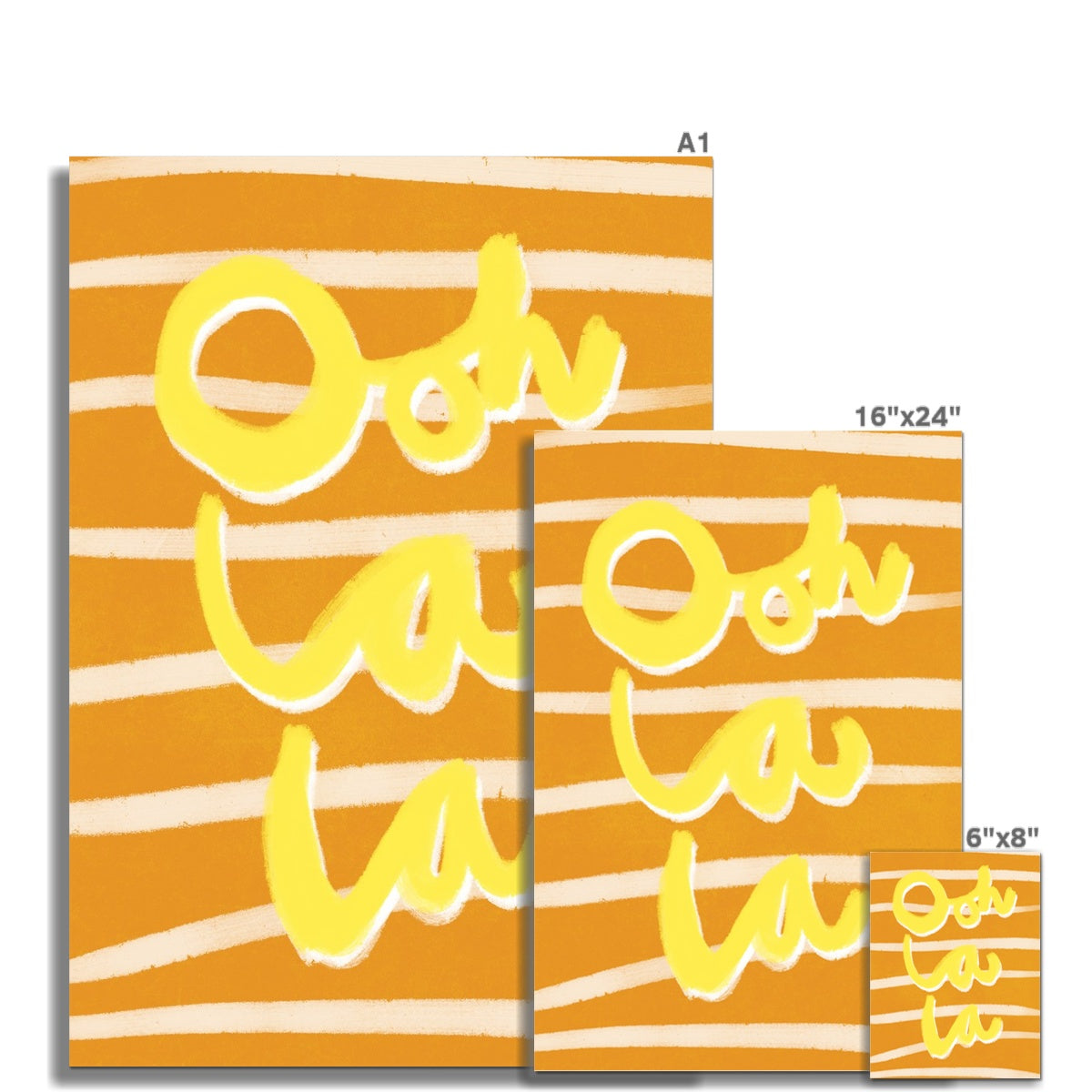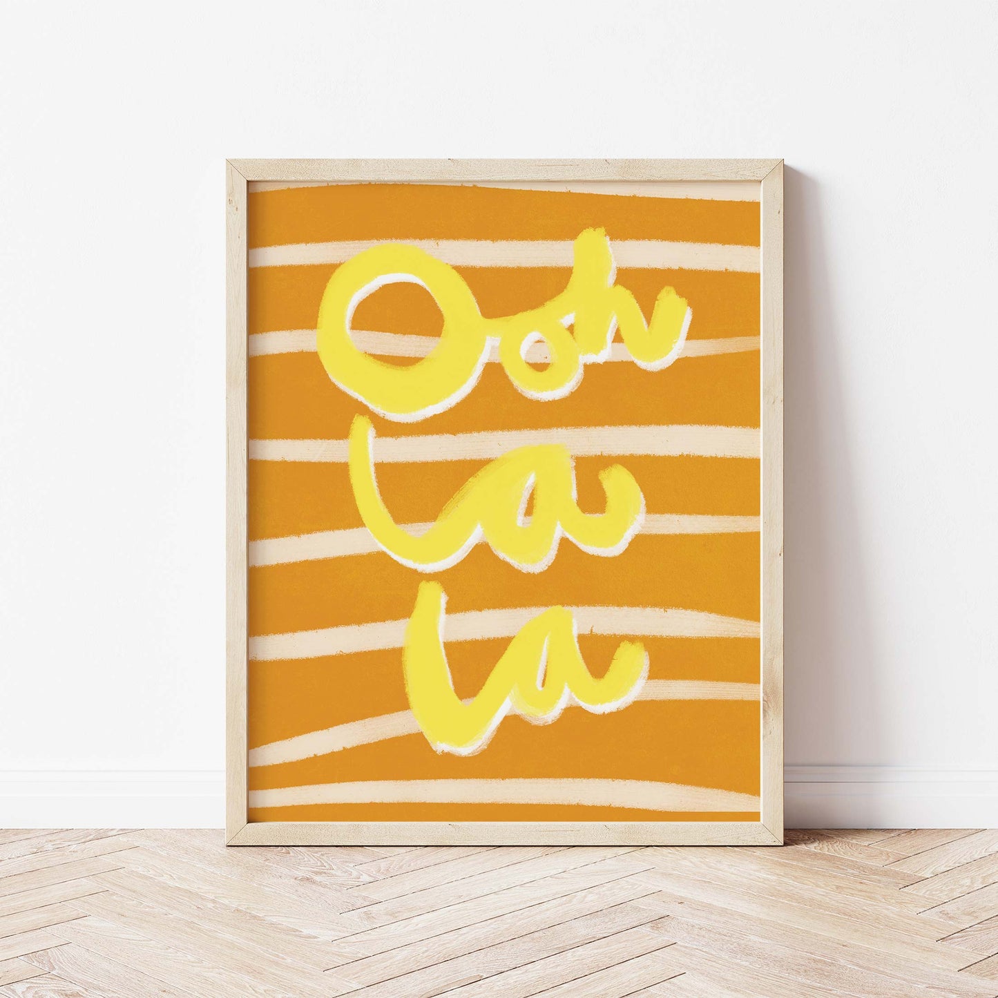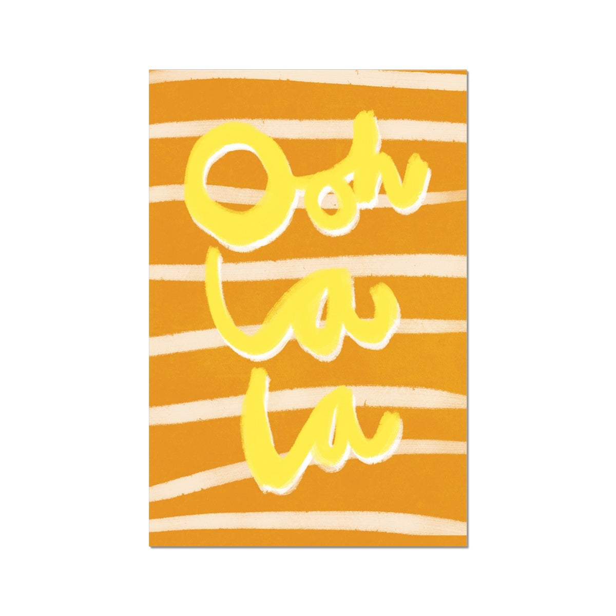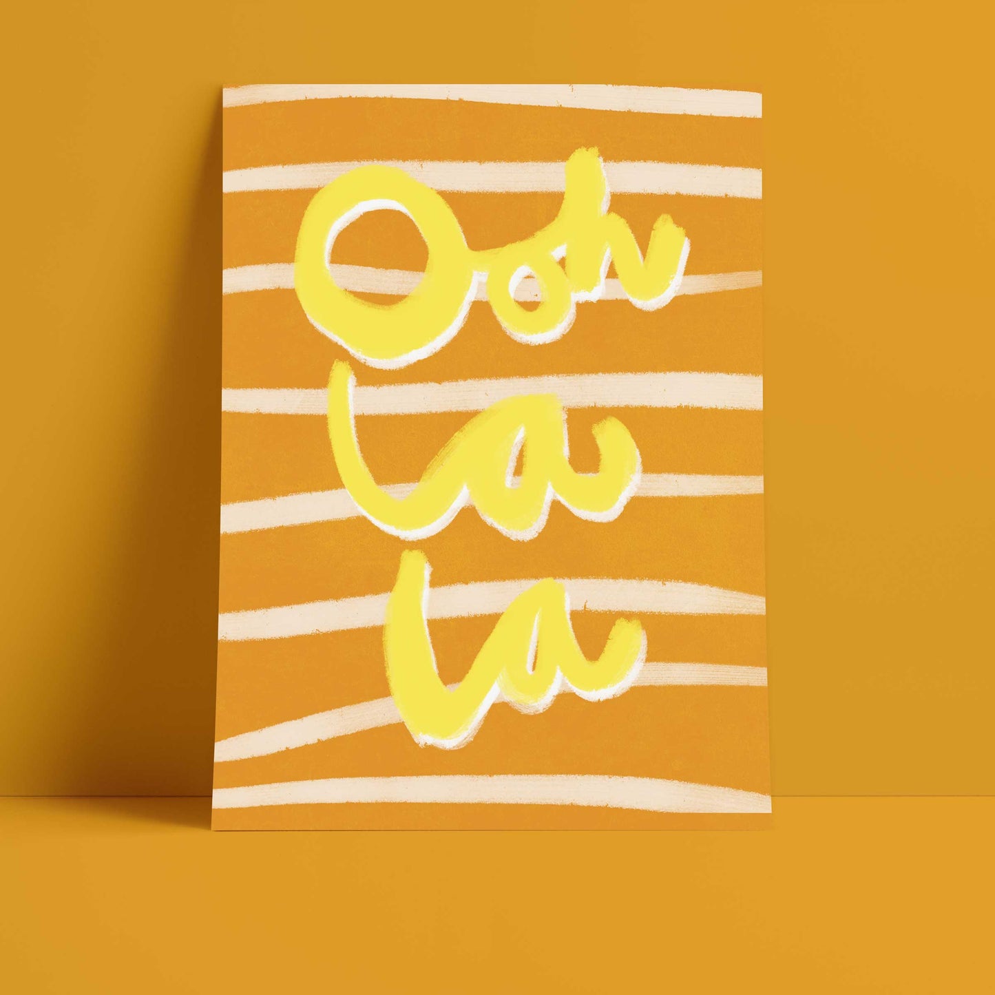 Our art print features the hand drawn yellow and white words 'ooh la la' in a gouche painted style, on a brown and white striped textured background. It is digitally printed by professional printers who are specialists in Giclée fine art printing.