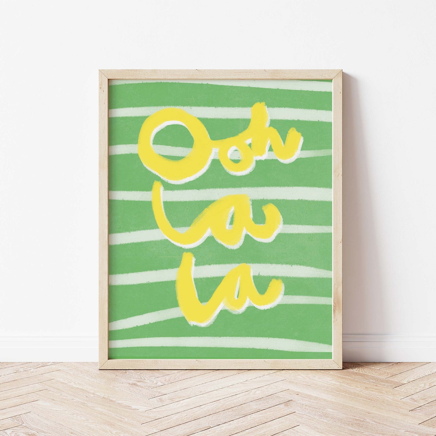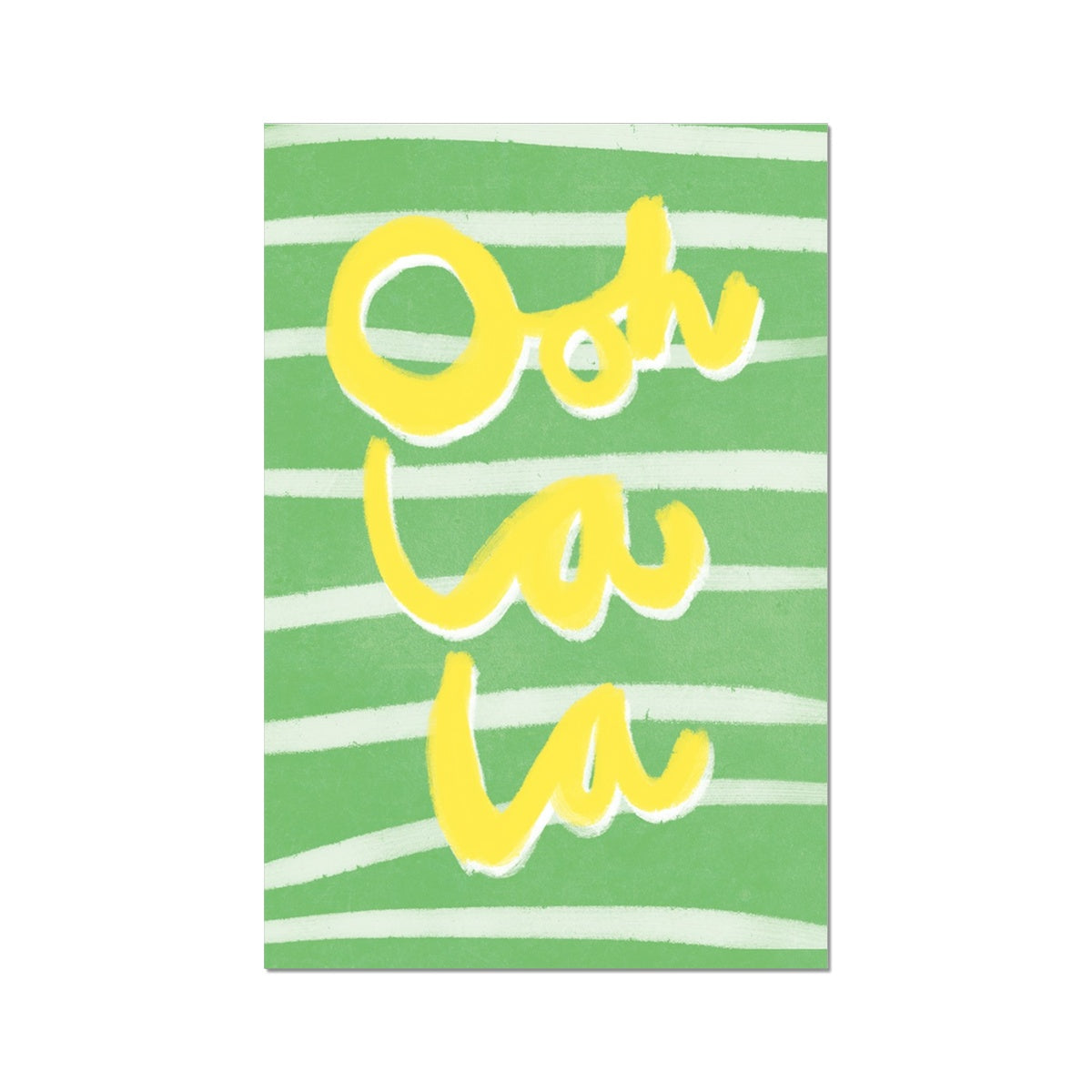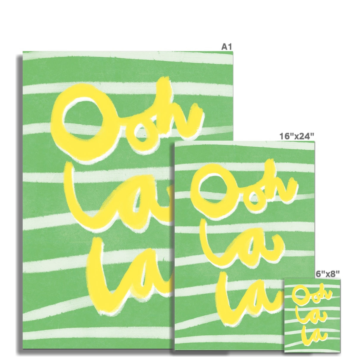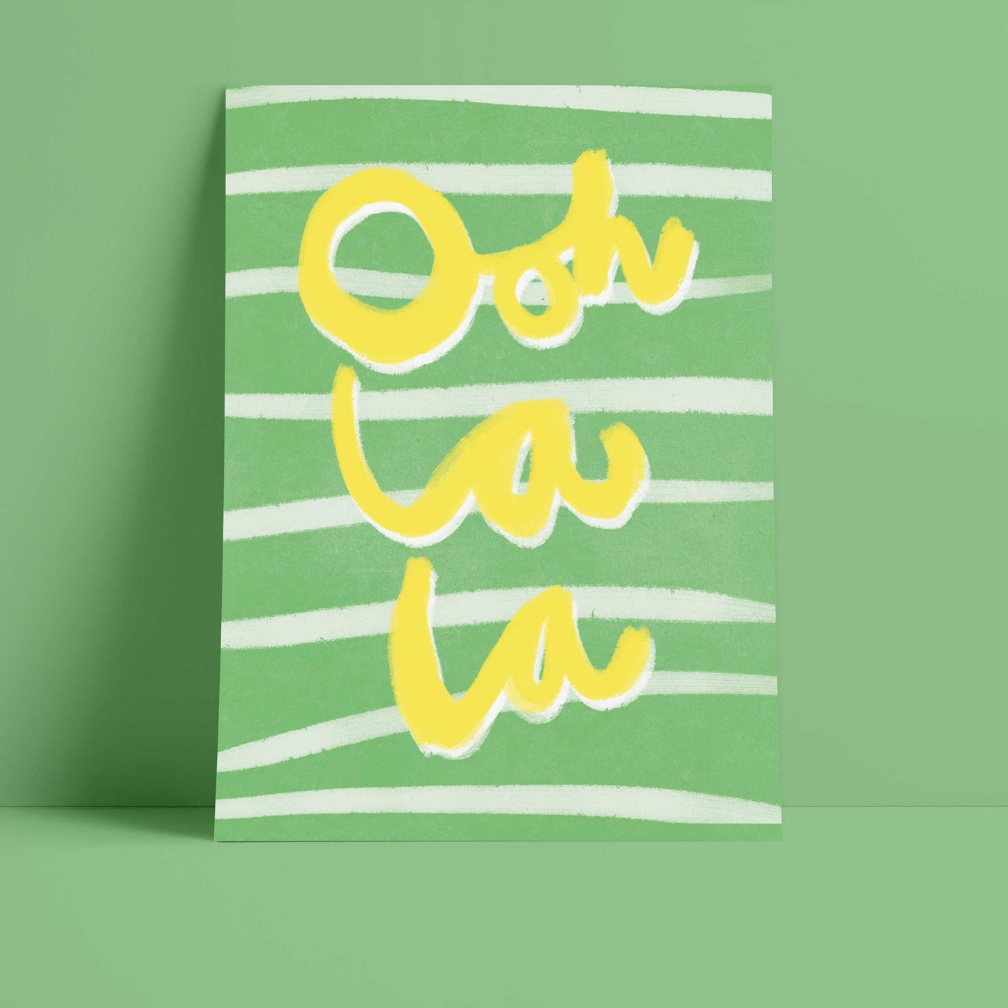 Our art print features the hand drawn yellow words 'ooh la la' in a gouche painted style, on a green and white striped textured background. It is digitally printed by professional printers who are specialists in Giclée fine art printing.