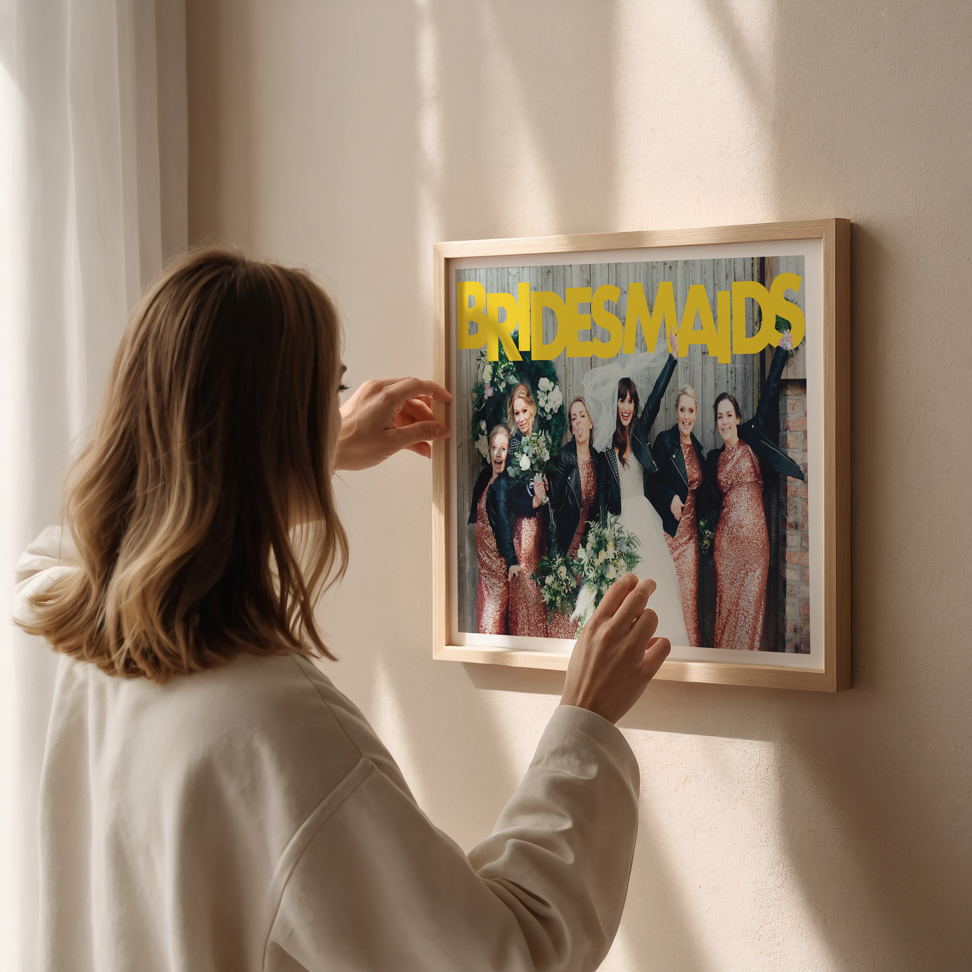 Looking for a heartfelt, personalized gift for your bridesmaids? This custom photo print with bold text overlay is the perfect way to capture memories and show appreciation to your bridal party. With a stylish magazine-inspired design, this print is perfect for Christmas gifts, wedding day thank yous, or as a special keepsake for your bridesmaids.