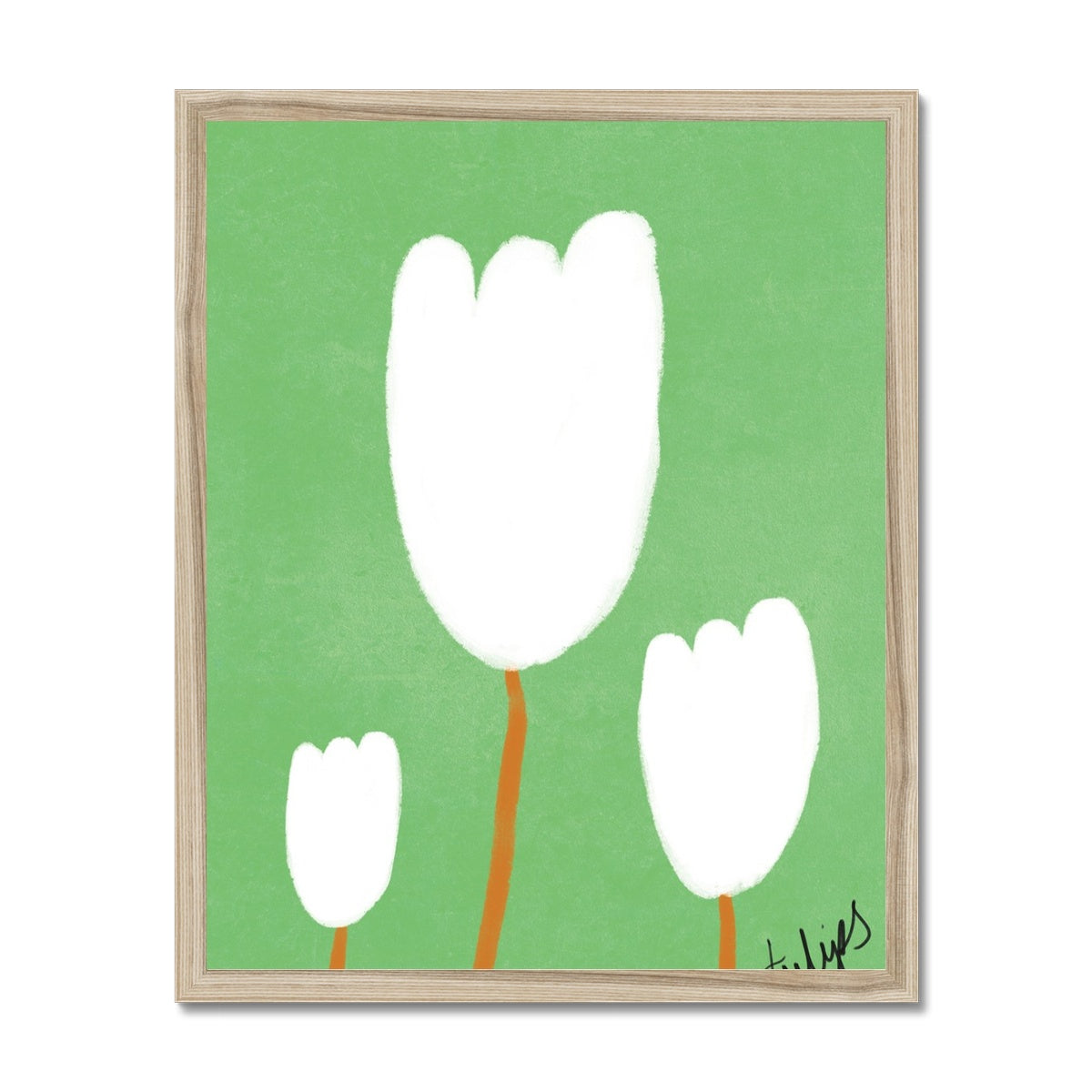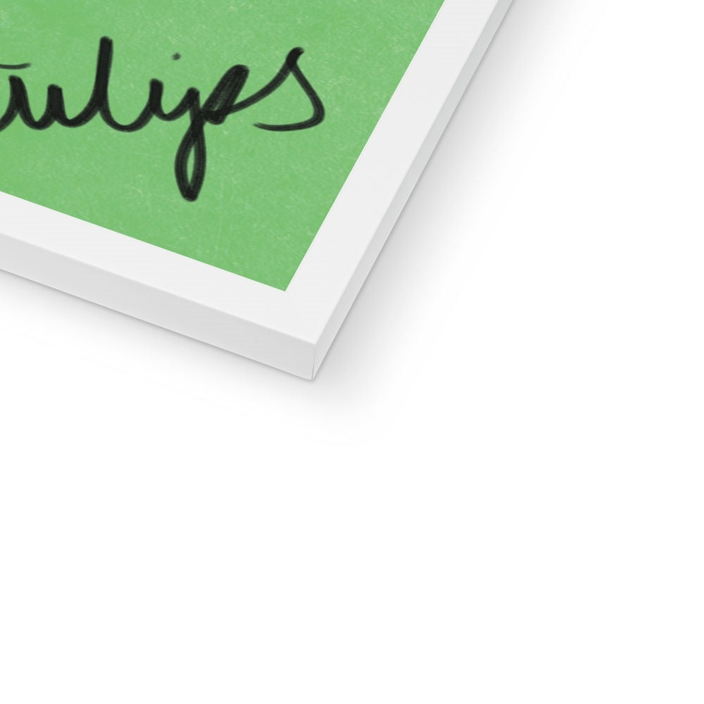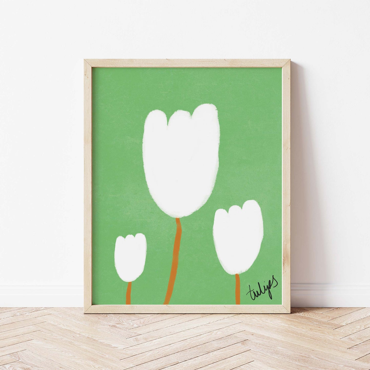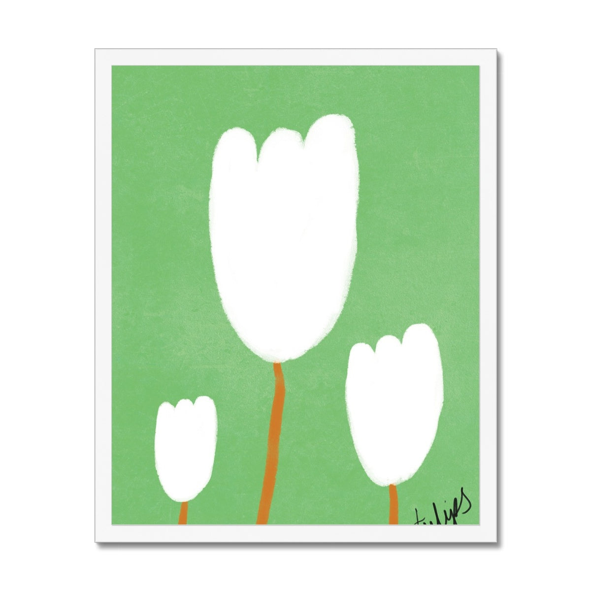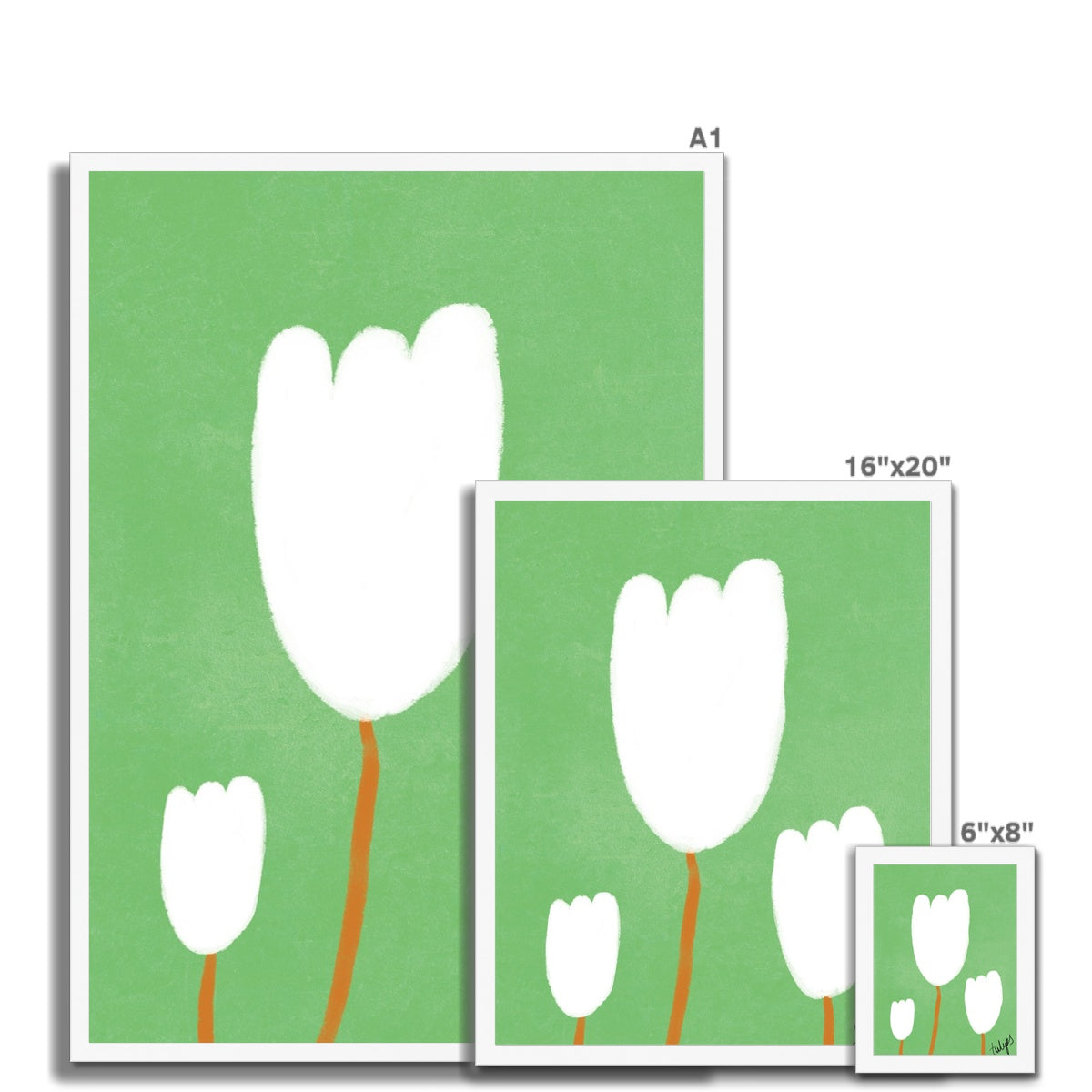 Our art print features three hand drawn tulips in a white and brown gouche painted style, on a green textured background. It is digitally printed by professional printers who are specialists in Giclée fine art printing and features the hand drawn word 'tulips' in black in the right hand corner.