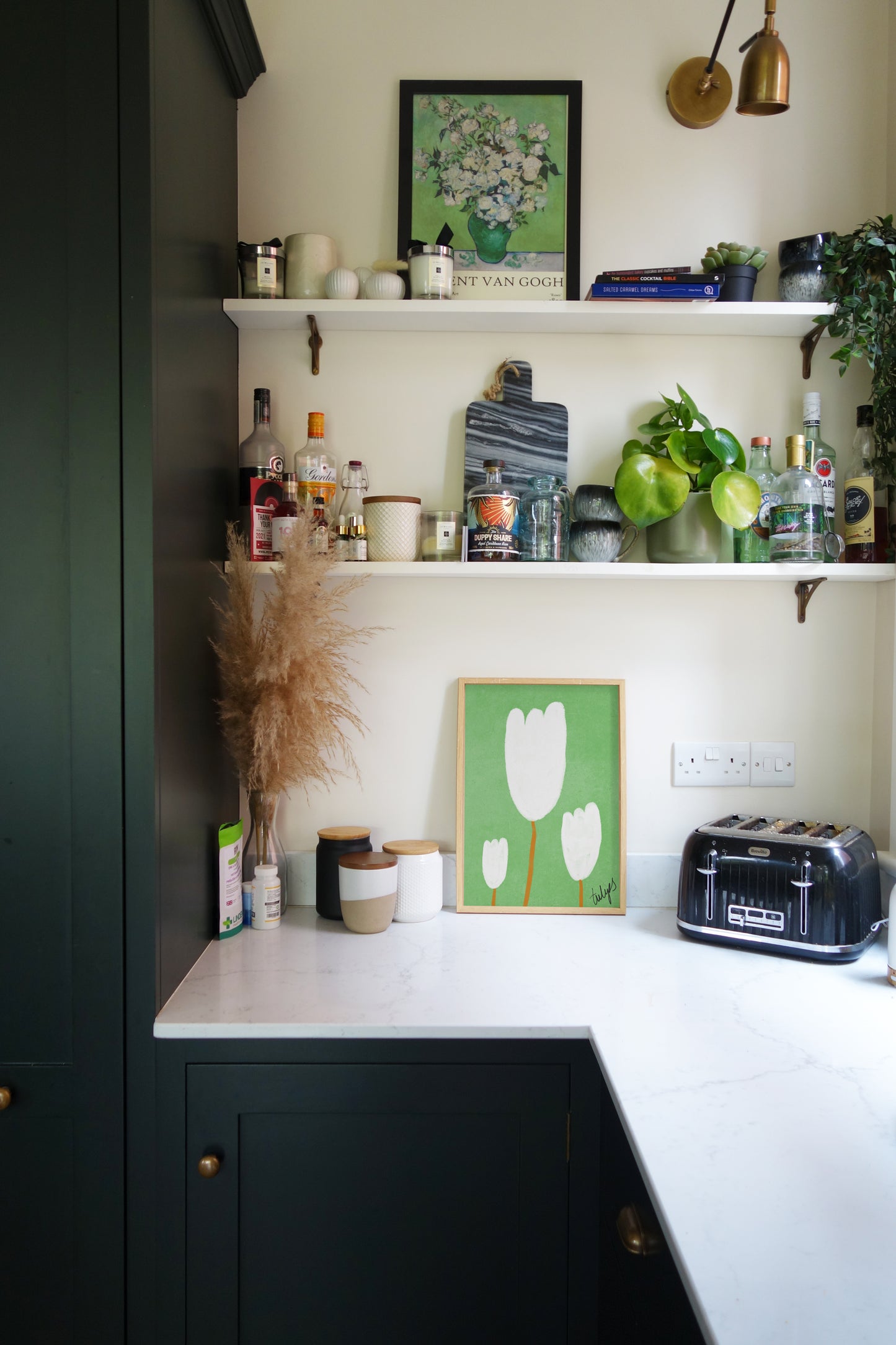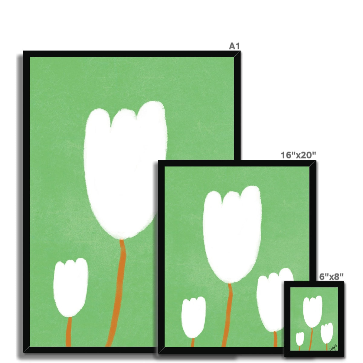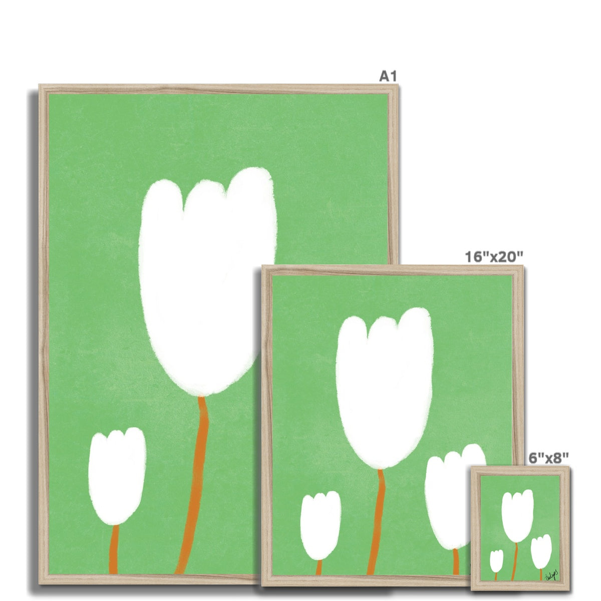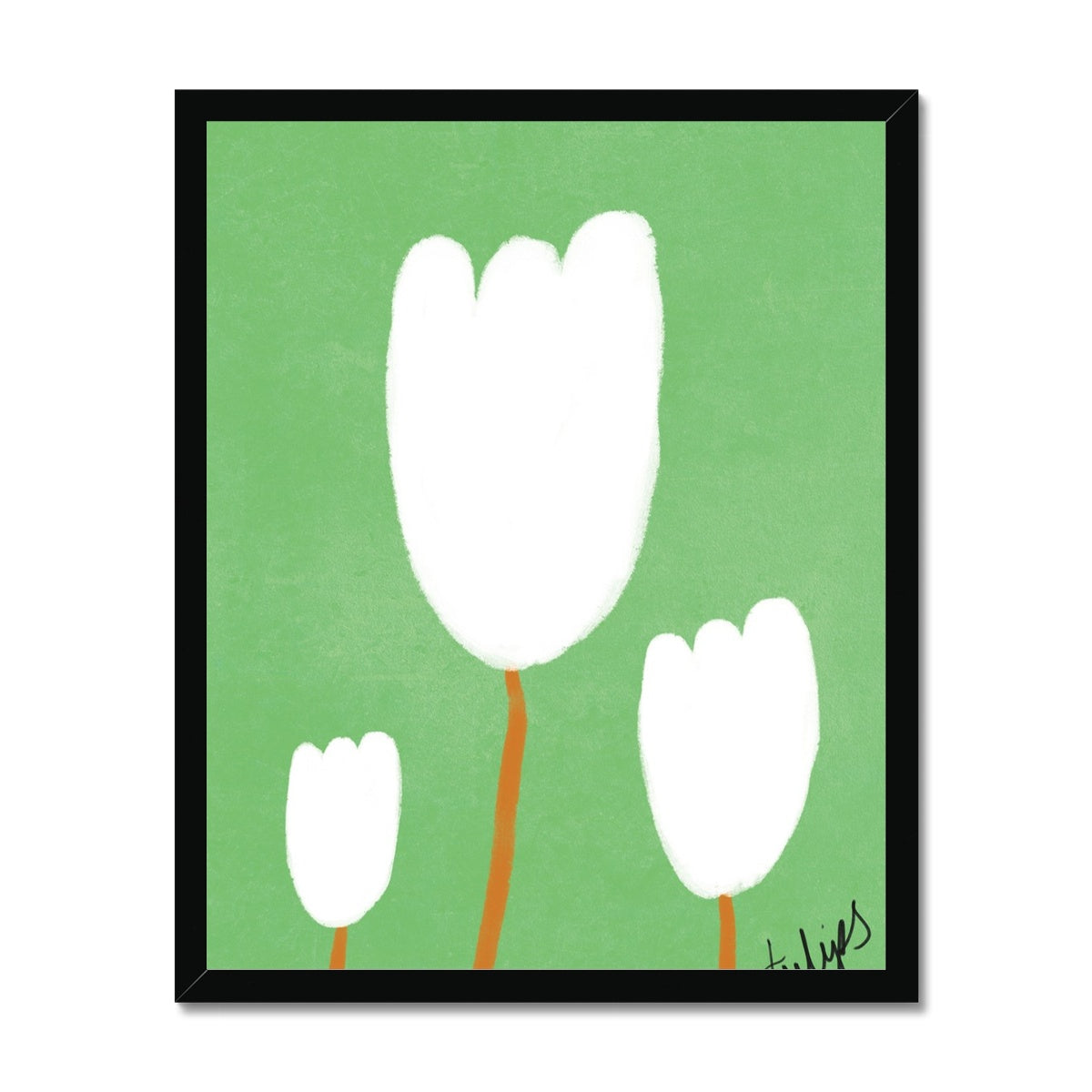 Our art print features three hand drawn tulips in a white and brown gouche painted style, on a green textured background. It is digitally printed by professional printers who are specialists in Giclée fine art printing and features the hand drawn word 'tulips' in black in the right hand corner.