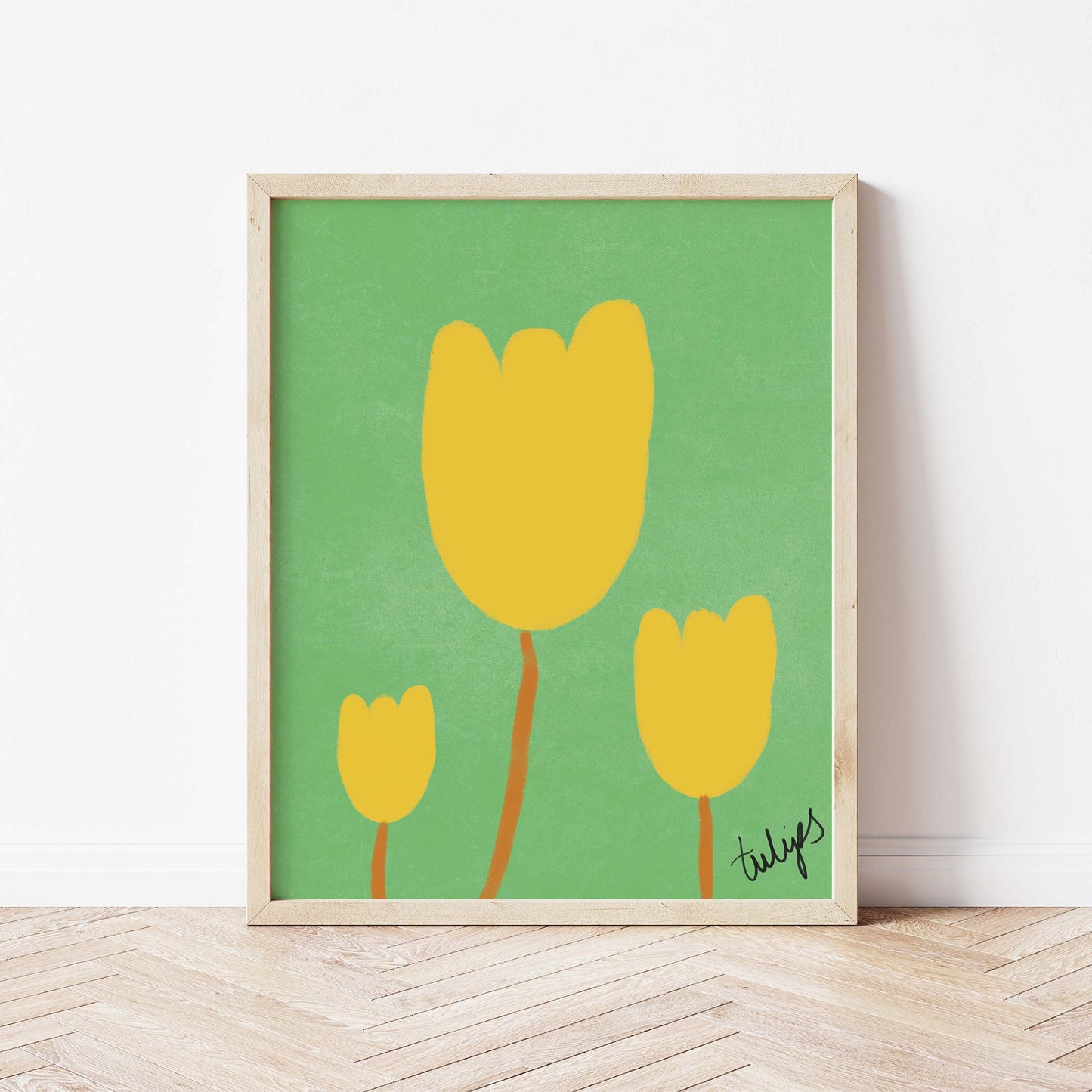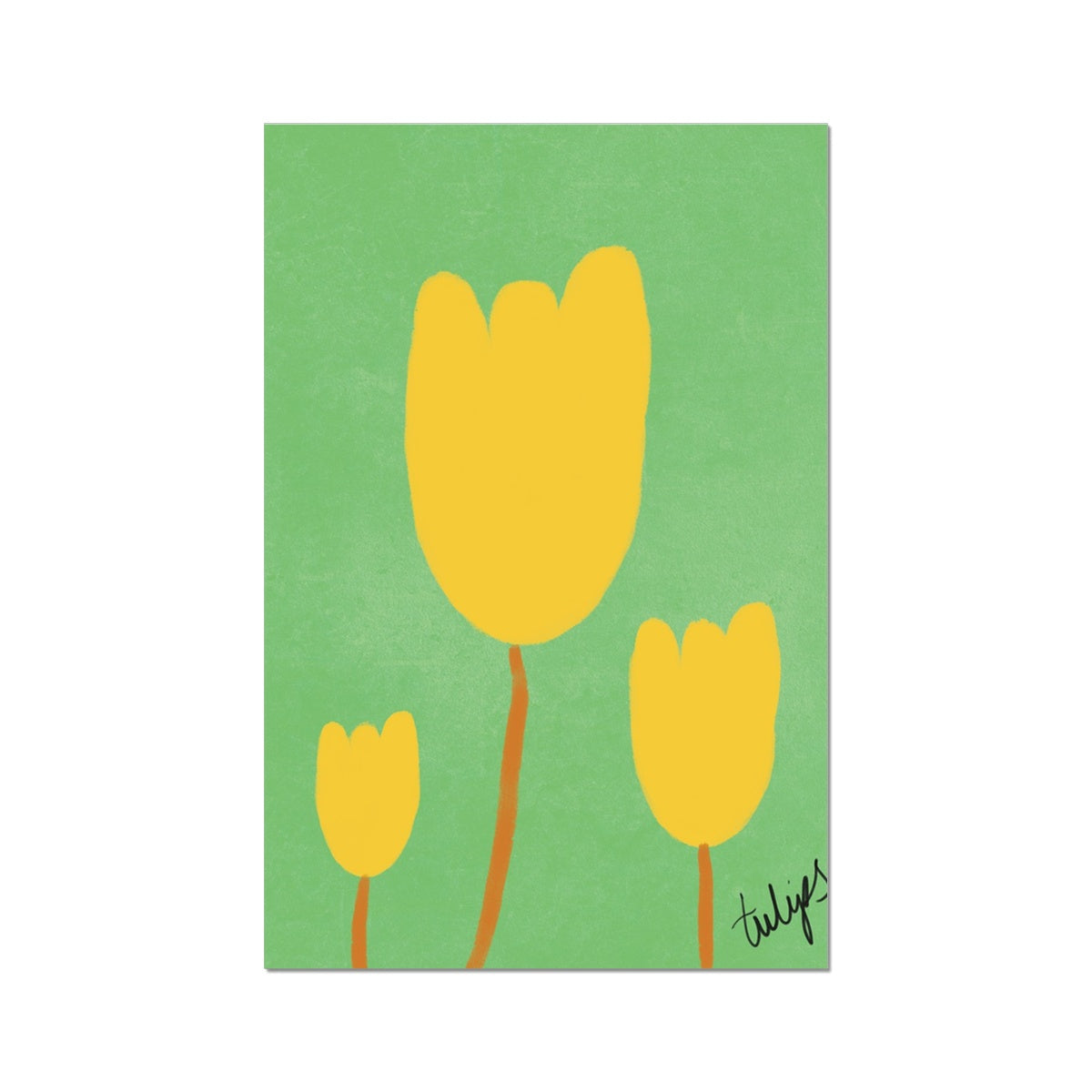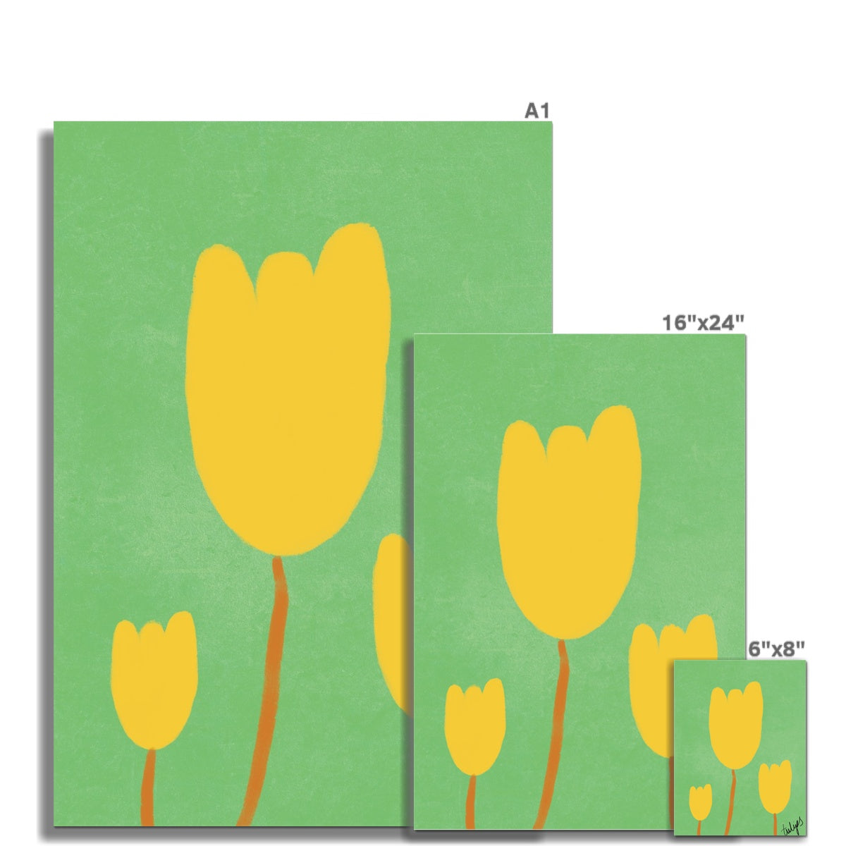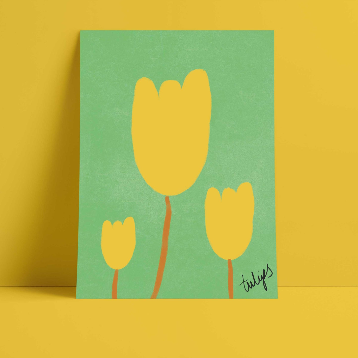 Our art print features three hand drawn tulips in a yellow and brown gouche painted style, on a green textured background. It is digitally printed by professional printers who are specialists in Giclée fine art printing and features the hand drawn word 'tulips' in black in the right hand corner.