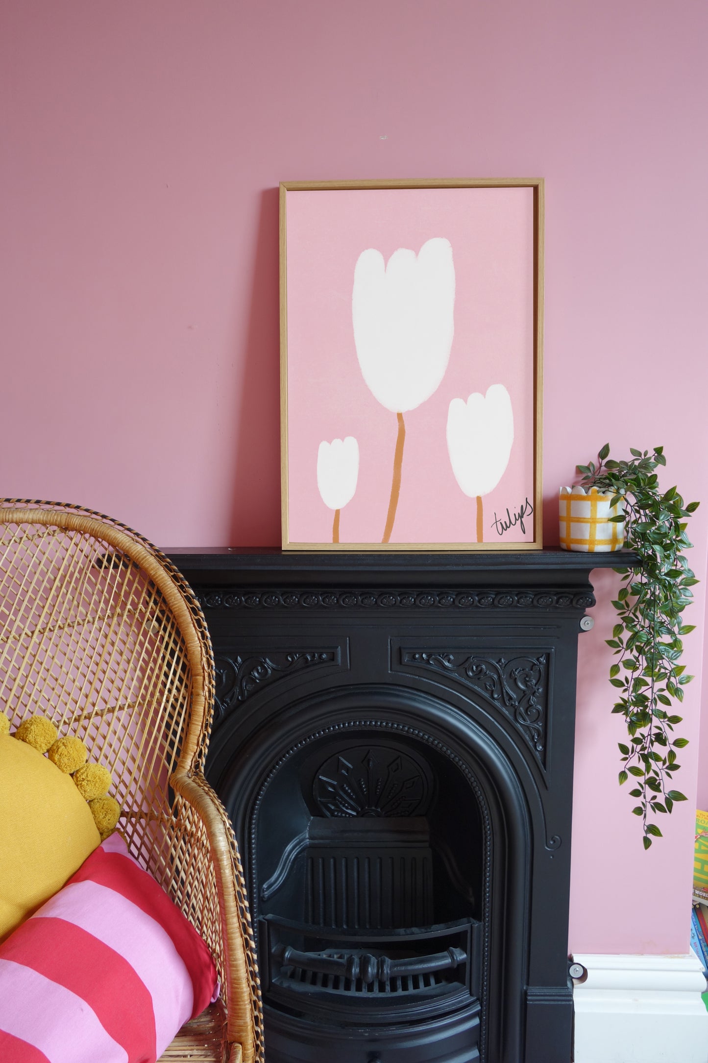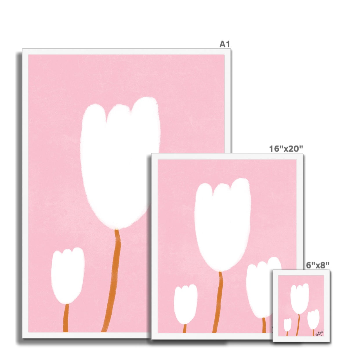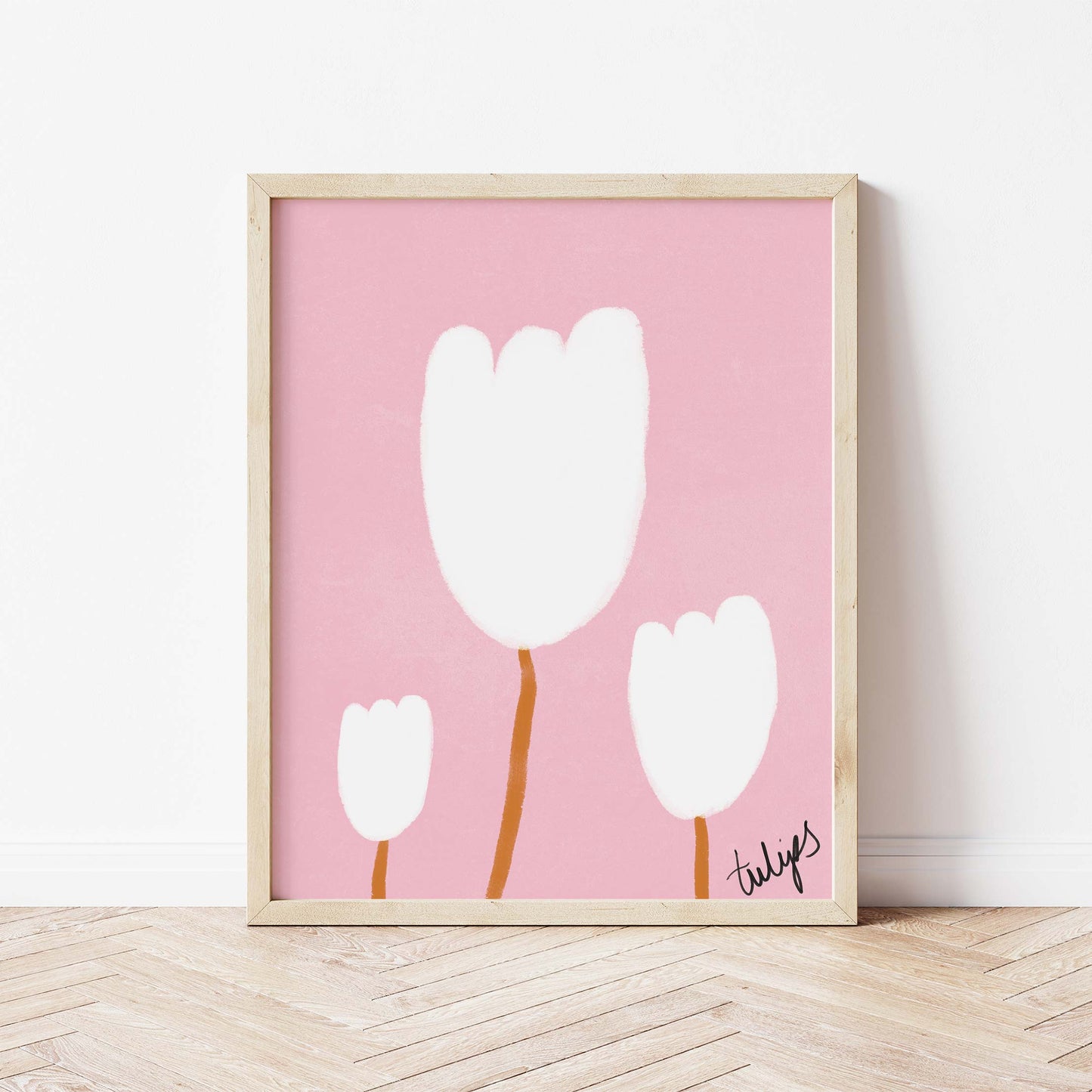 Our art print features three hand drawn tulips in a white and brown gouche painted style, on a pink textured background. It is digitally printed by professional printers who are specialists in Giclée fine art printing and features the hand drawn word 'tulips' in black in the right hand corner.