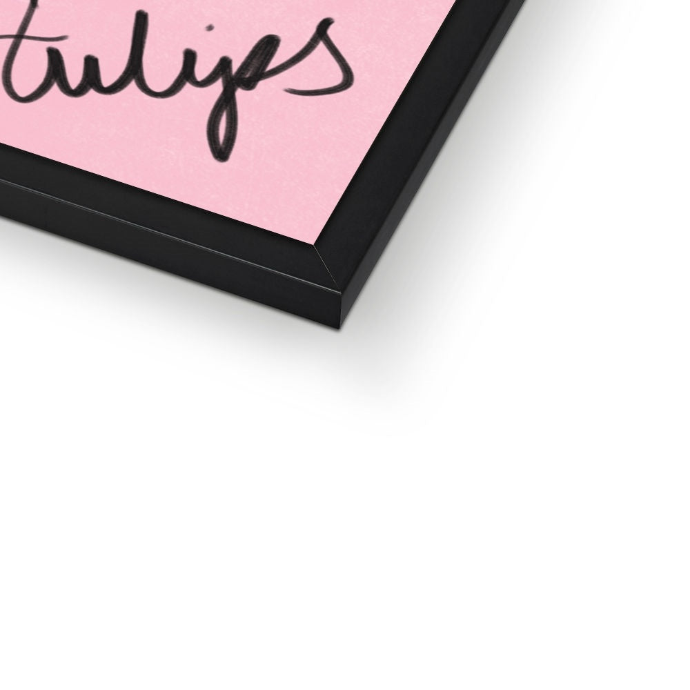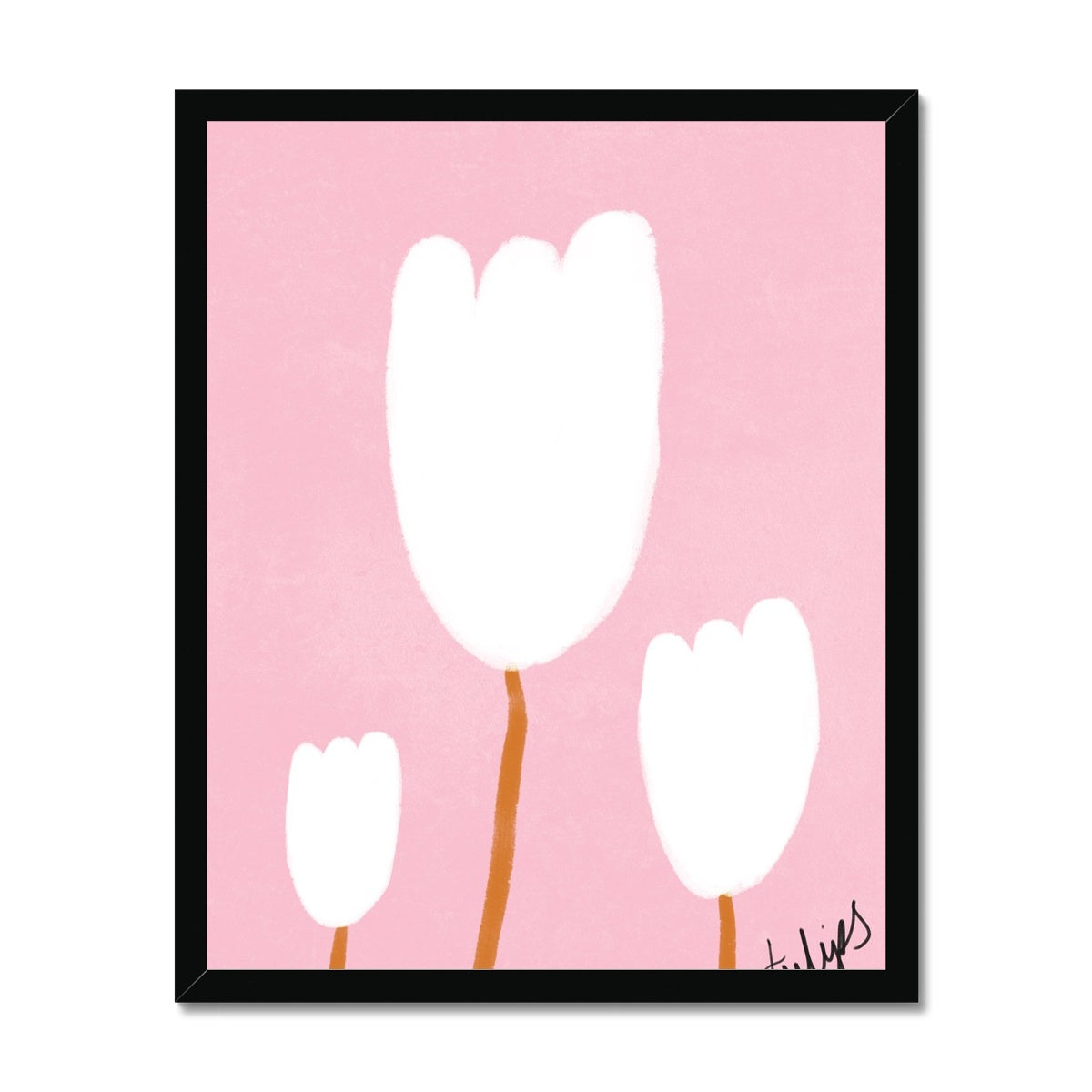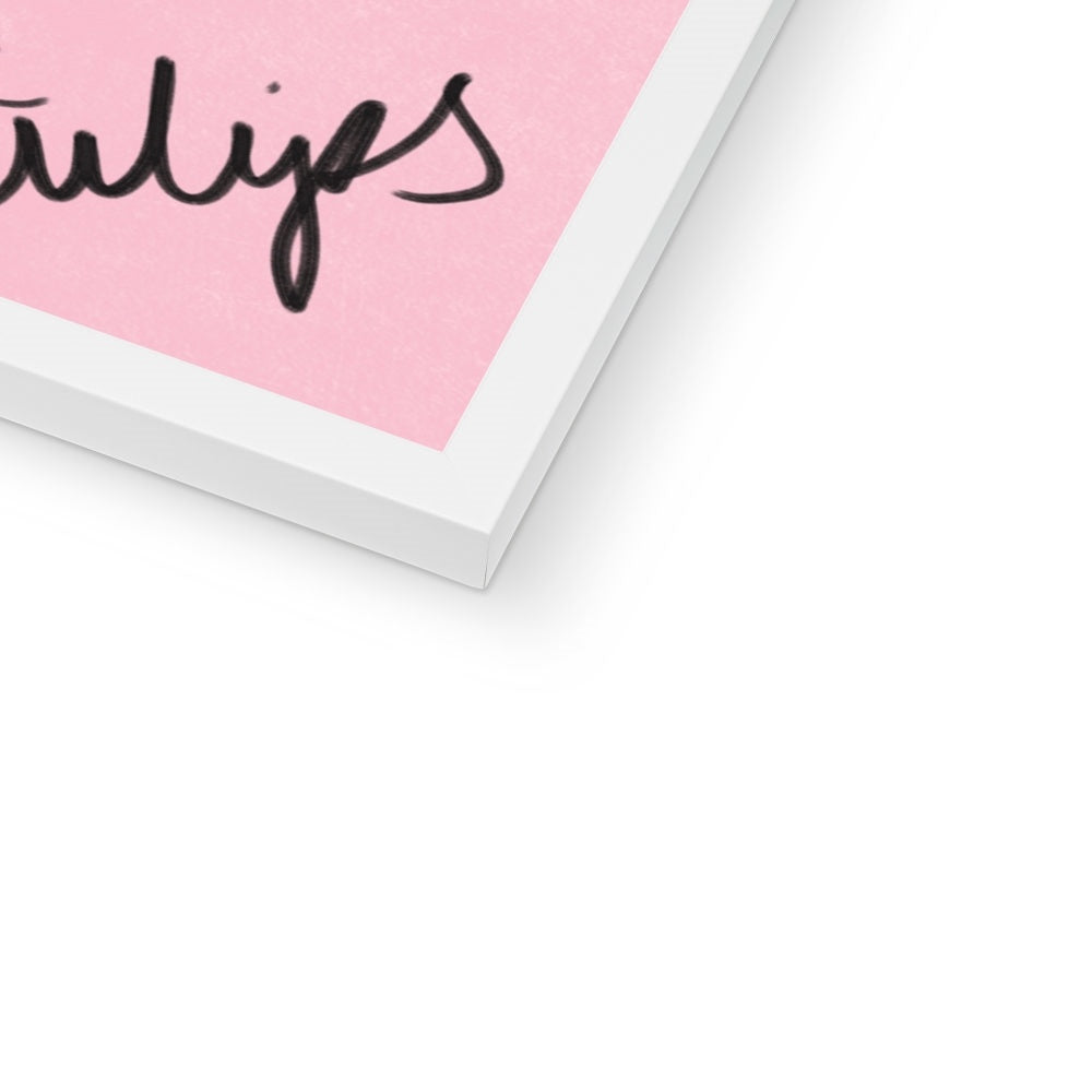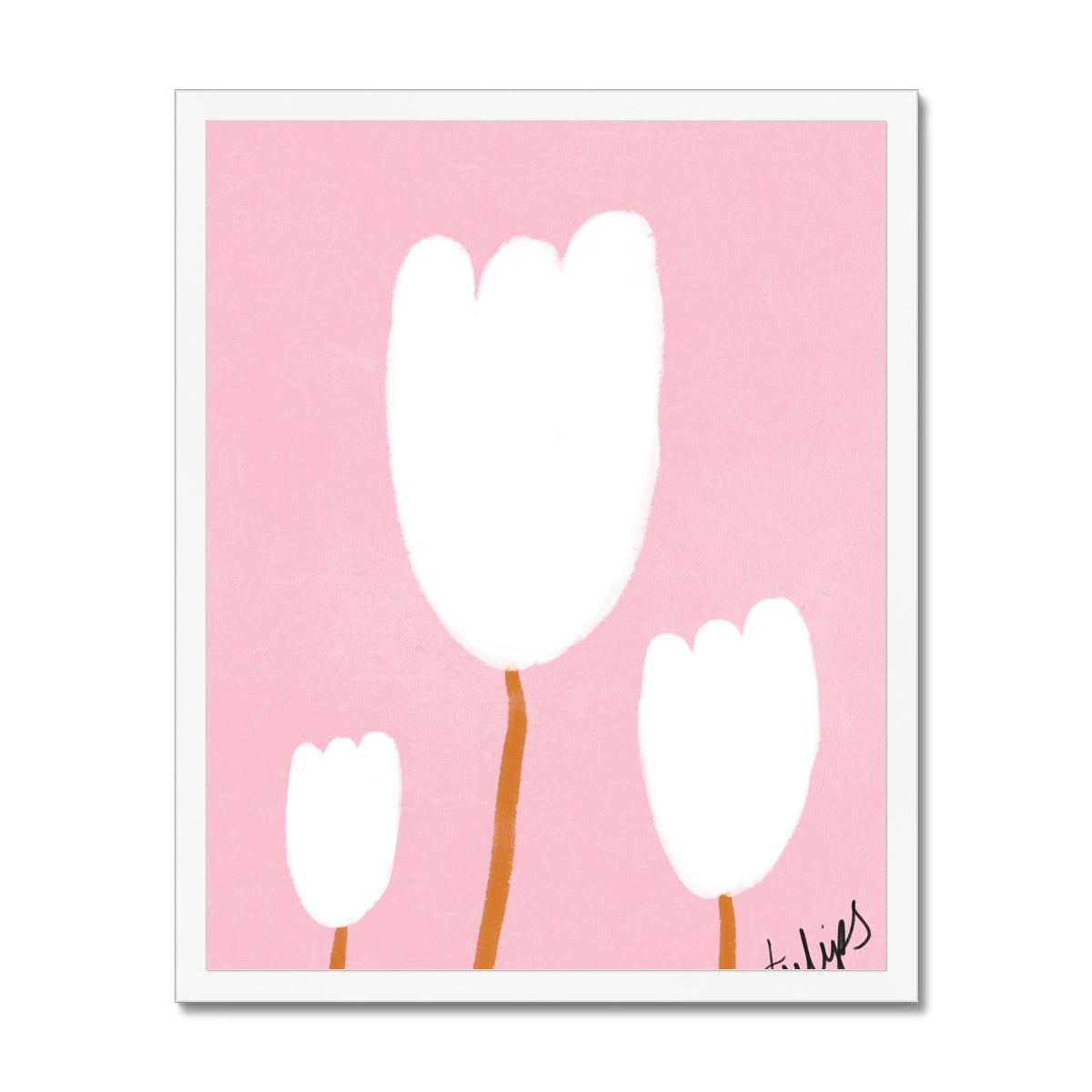 Our art print features three hand drawn tulips in a white and brown gouche painted style, on a pink textured background. It is digitally printed by professional printers who are specialists in Giclée fine art printing and features the hand drawn word 'tulips' in black in the right hand corner.