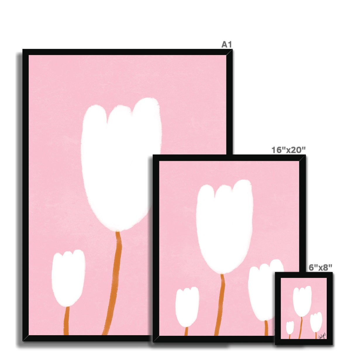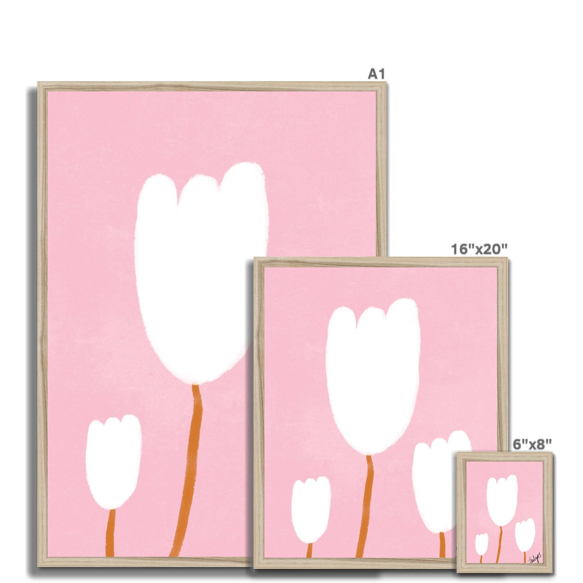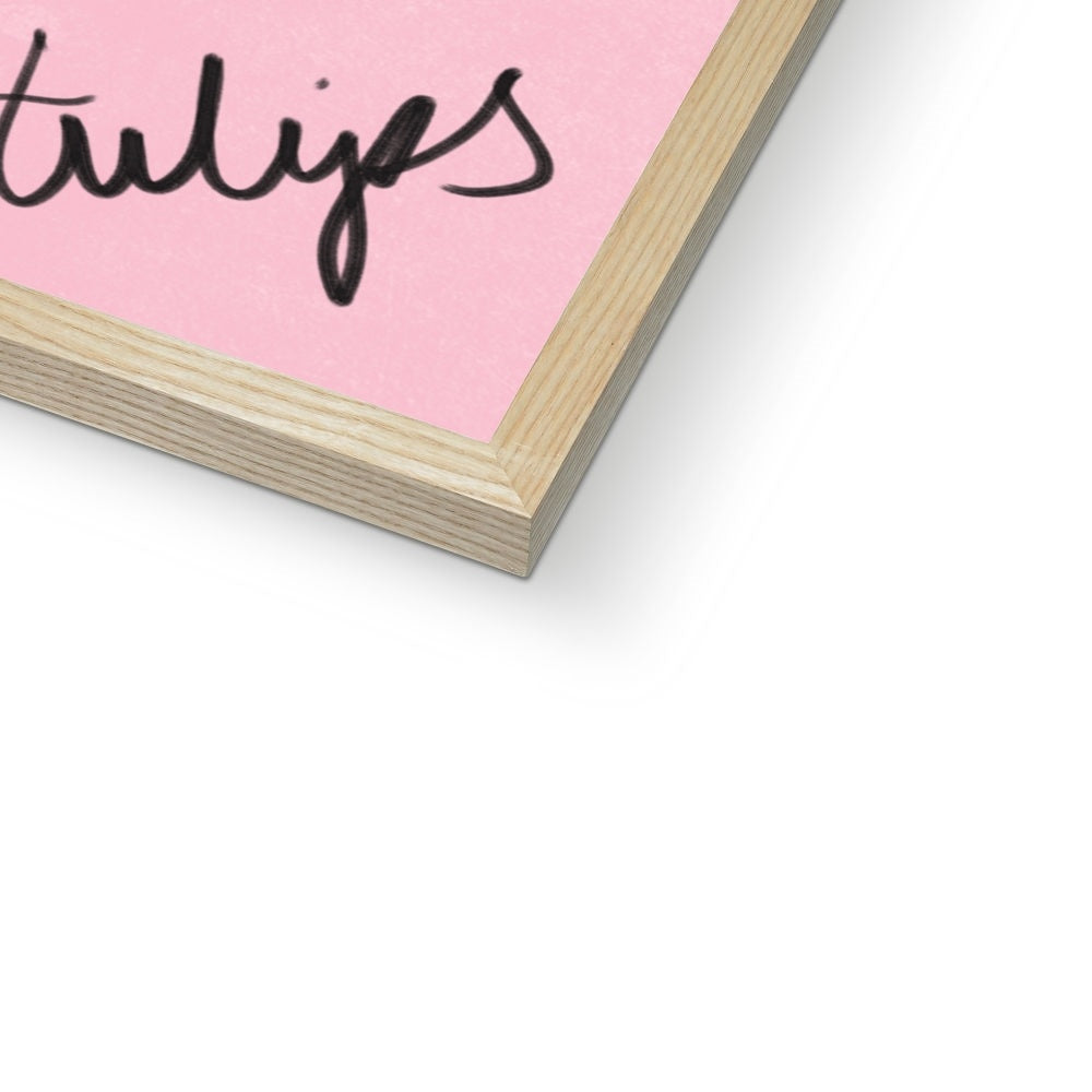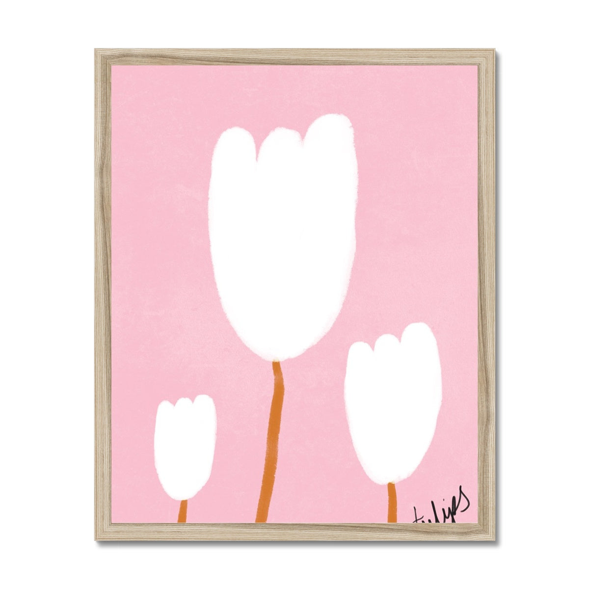 Our art print features three hand drawn tulips in a white and brown gouche painted style, on a pink textured background. It is digitally printed by professional printers who are specialists in Giclée fine art printing and features the hand drawn word 'tulips' in black in the right hand corner.