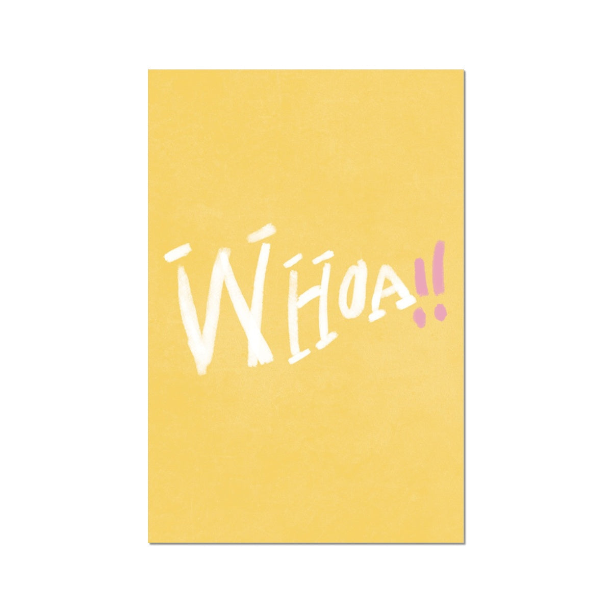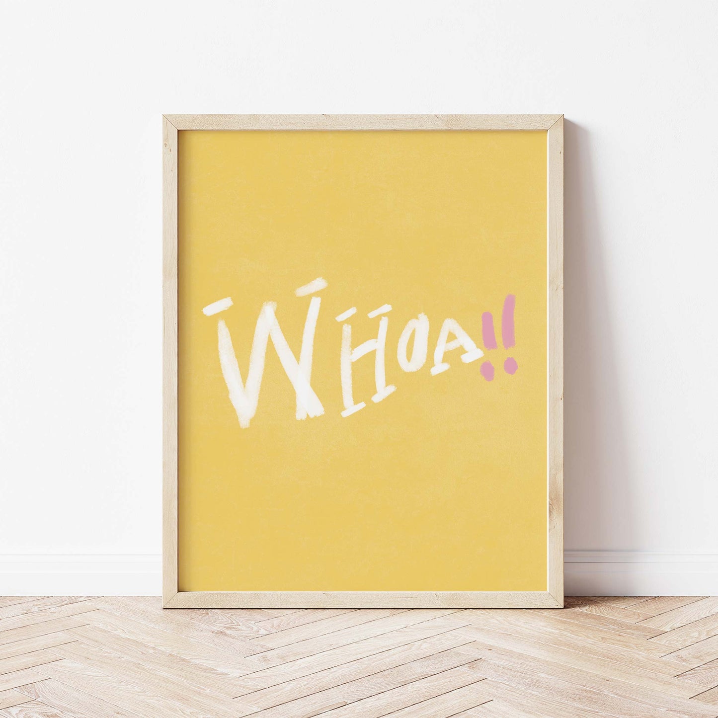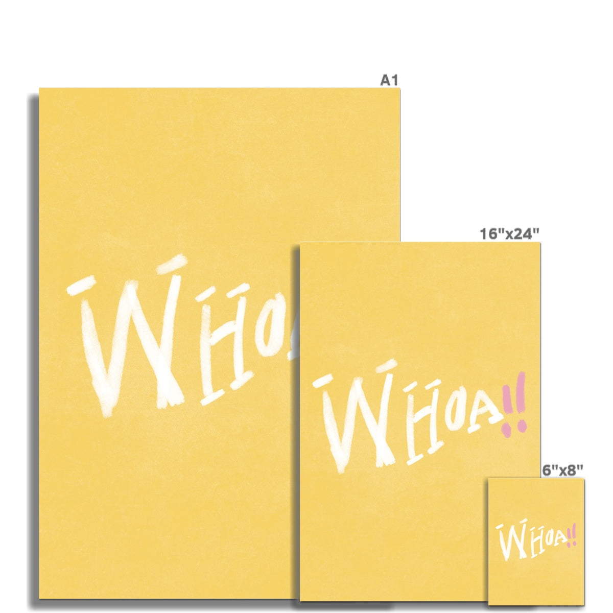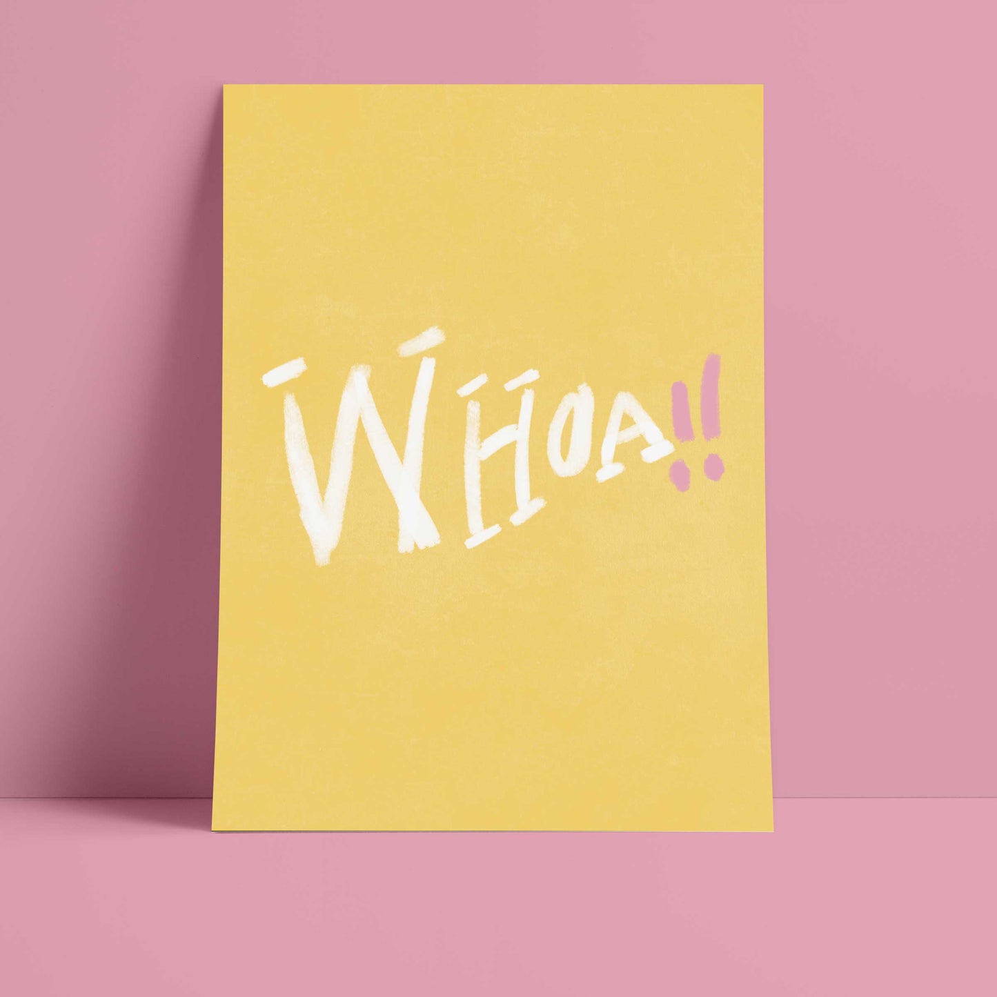 Our art print features the word 'whoa!!' hand drawn in a white and pink gouche painted style, on a yellow textured background. It is digitally printed by professional printers who are specialists in Giclée fine art printing.